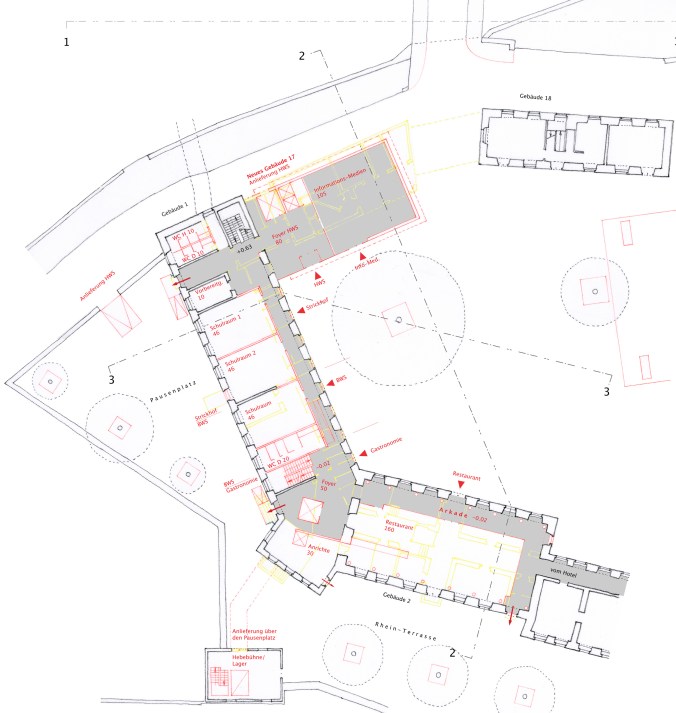 Verbindung “zum Wasser” Drei neue Zugänge zu den “Rhein Terrassen” sind geschaffen worden: 1. vom Mühlesaalbau, 2. vom Foyer zwischen Mühlesaal- und Wolff-Bau, 3. vom Wolffbau.