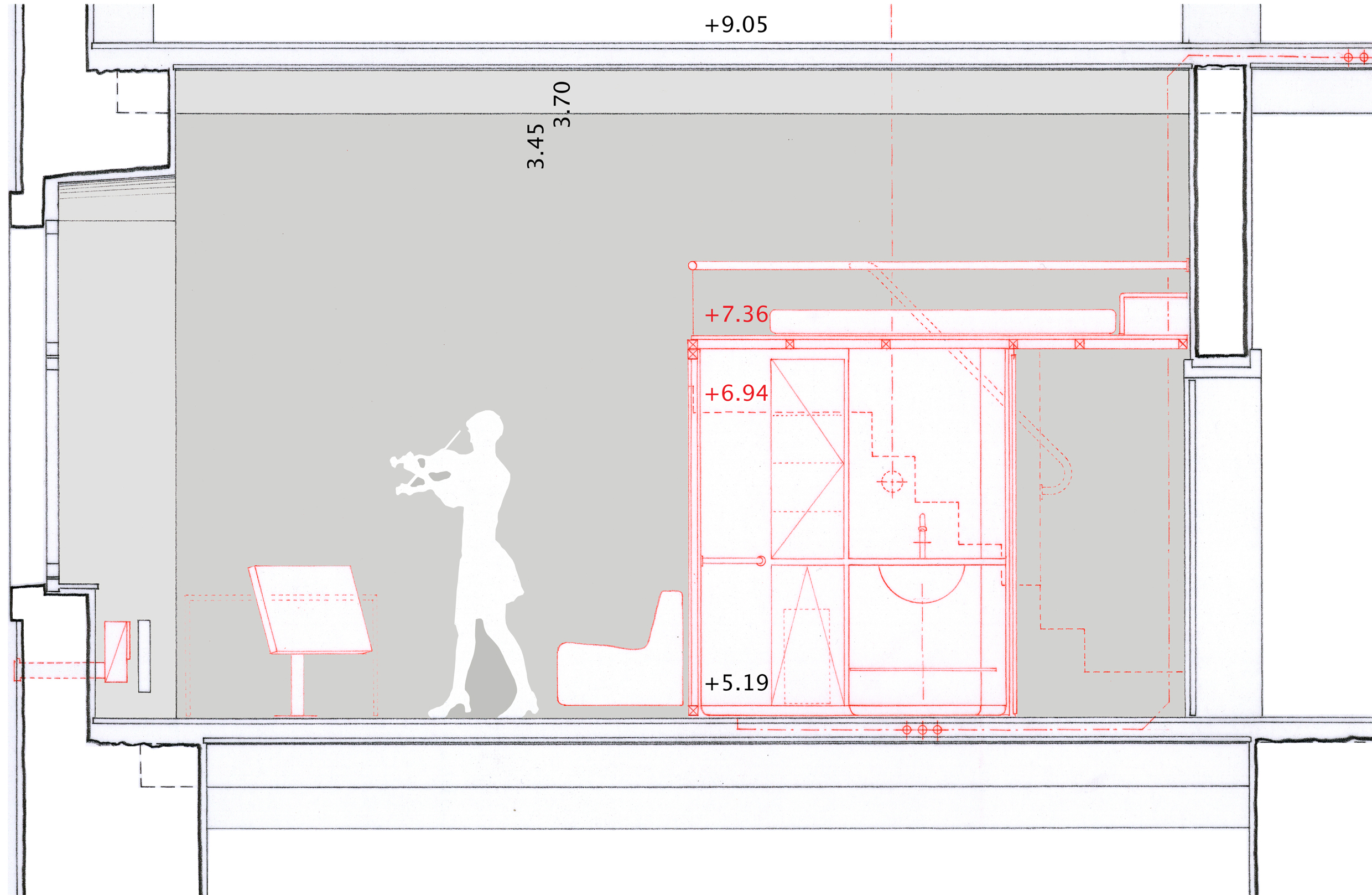 Aus denkmalschützerischen Gründen wird die Nasszelle, die Box, frei in den Raum gestellt. Eine schmale, 55 cm breite, treppe führt auf eine kleine Plattform, 1,75 m über dem bestehenden Fussboden. Von dieser wird die auf 2.17 m liegende Matratze bestiegen (Grösse: 140×210 m im EZ, 200×210 m im DZ).