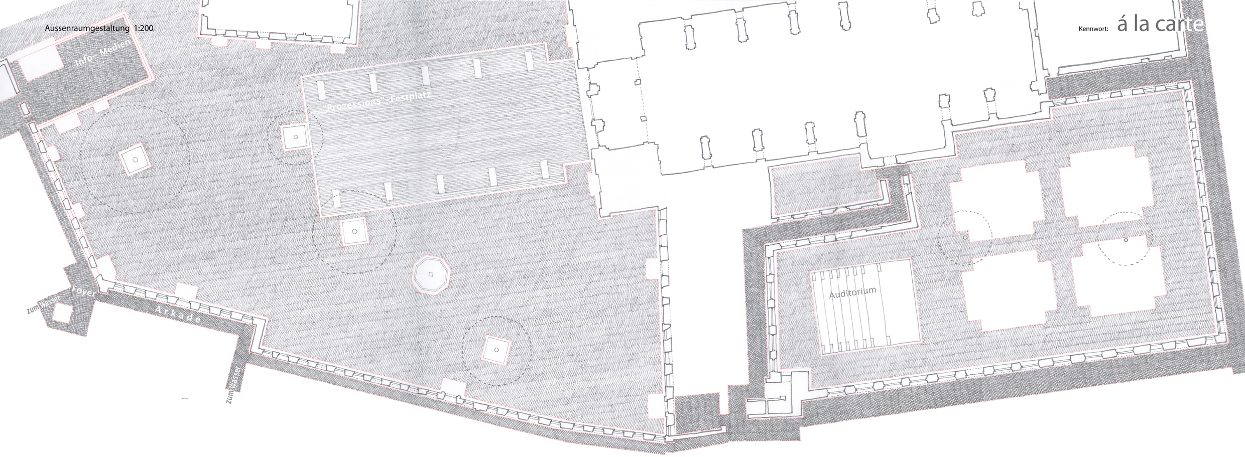 Klostergarten Durch den Haupteingang der ehemals abgeschlossenen Klosteranlage, südlich der Klosterkirche, betreten wir das Zentrum des Klosters; schreiten dann den Kreuzgang entlang, am Silentium-Glöckchen vorbei und in den, auf vier Seiten umgebenen, Garten. Schön ist er wieder, seit die Küche weg ist. Die Gelegenheit wurde genutzt, den Keller der rückgebauten Küche in ein open-air Auditorium zu verwandeln. Die zwei grossen Bäume sind geblieben und, in Anlehnung an den archetypischen Klosterplan, symetrische Blumen und Kräuterbeete angelegt worden. Diese sind leicht abgesenkt, damit nur das “farbige” der Pflanzen sichtbar ist. Die Restflächen sind mit demselben Stein wie im Klosterhof gepflästert, das Material und die Verlegearbeiten sind von exquisiter Qualität.