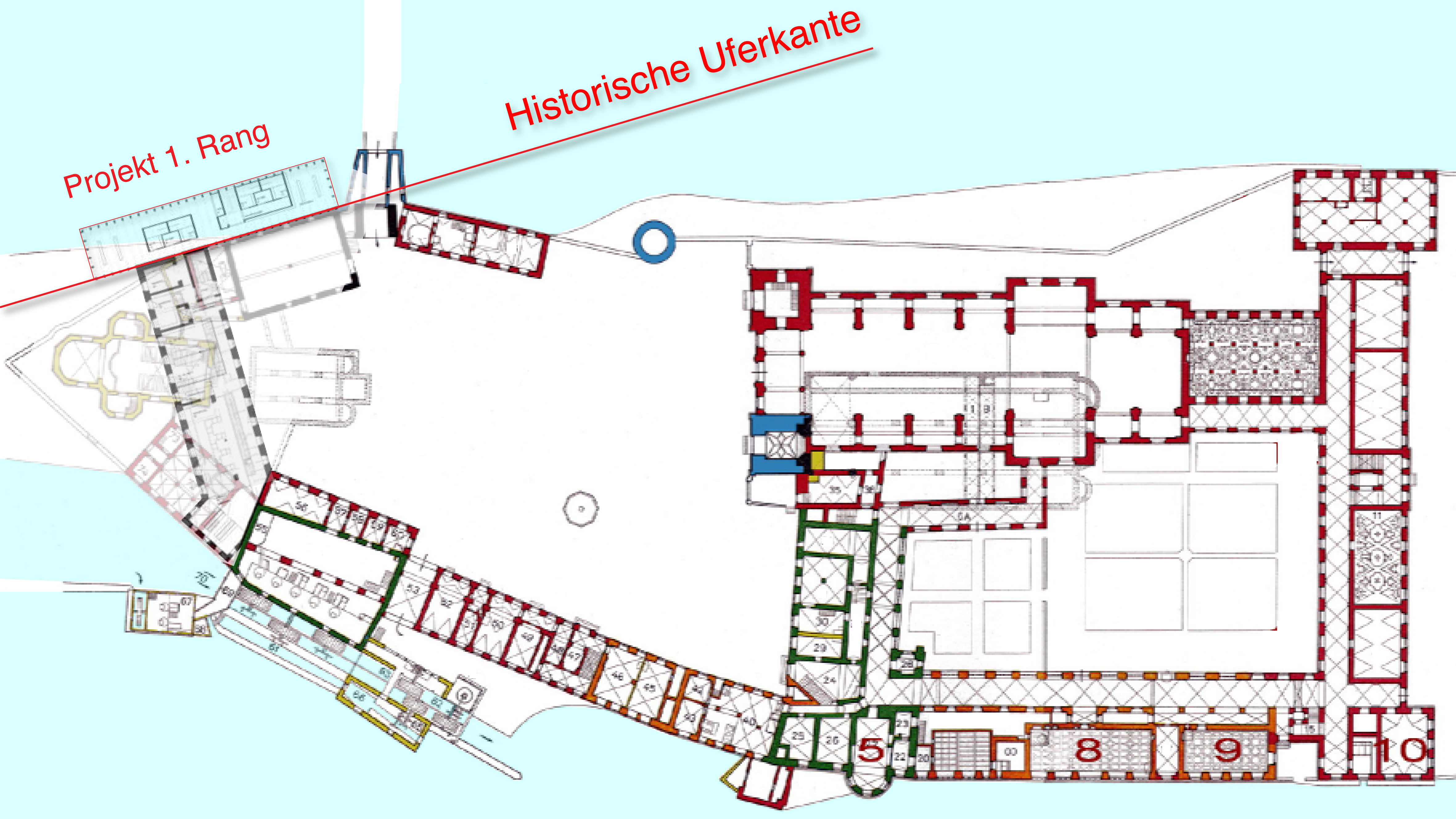 Nun, aus allen historischen Abbildungen ist ersichtlich, dass die vorhandene Klosteranlage als “steinerne Insel”, ähnlich einem Wasserschloss, und mit einer Brücke mit dem “Festland ” verbunden, geplant und gebaut wurde. Dass aber das neu geplante Gebäude vollständig ausserhalb der historischen Uferkante zu liegen kommen soll und damit den (historischen) Flussraum des kleinen Rhein’s erheblich beschneidet (siehe Illustration oben), wird im Bericht der Jury an keiner Stelle erwähnt.