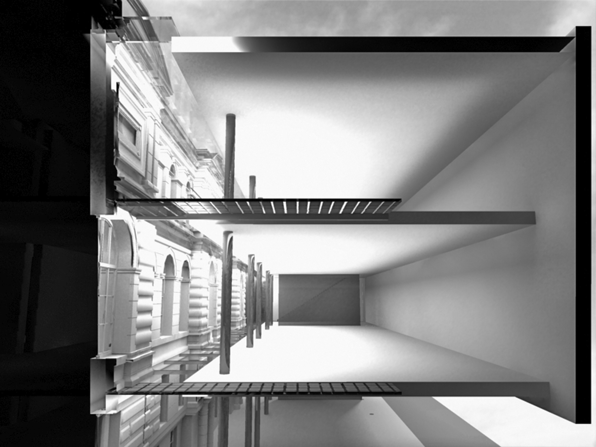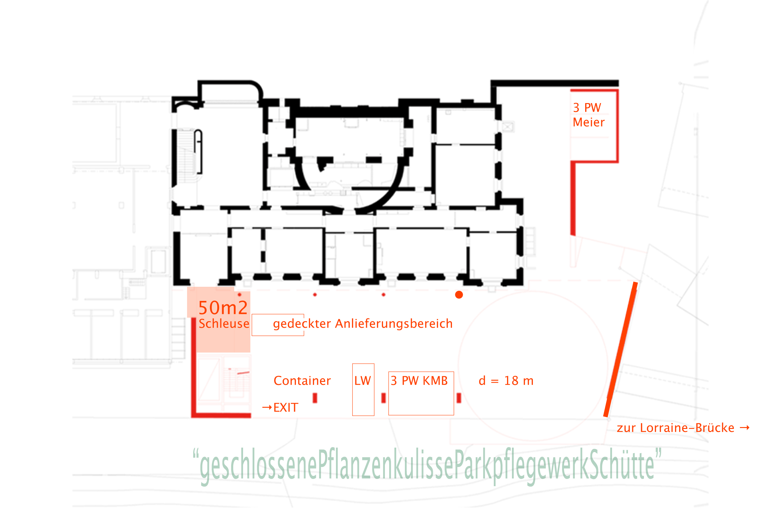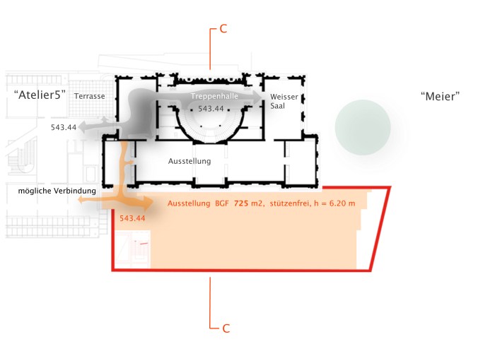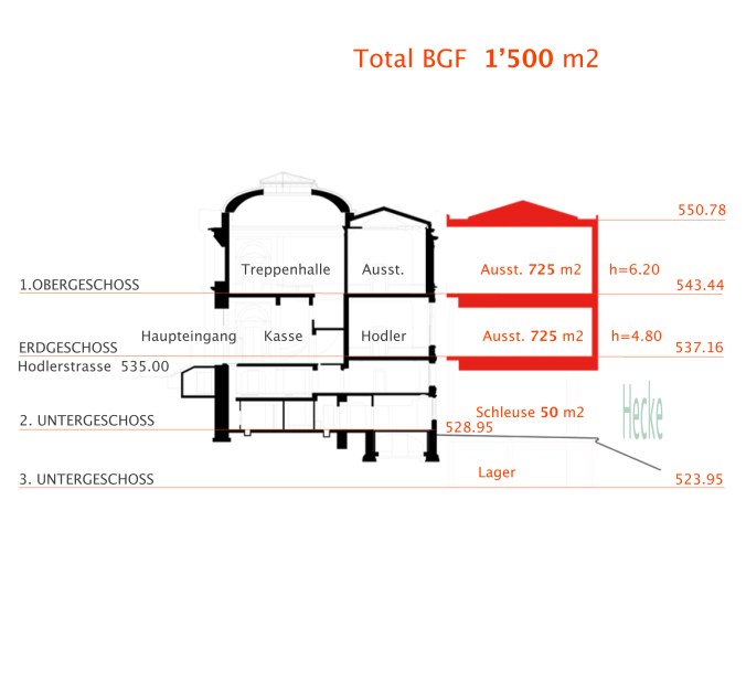 Funktionale Beziehung zwischen dem geplanten Neubau und den vorhandenen Gebäuden “Stettler” – Die Nord-Fassade wird im Bereich des Erd- und des 1. Obergeschosses zur “Innen-Fassade”, ohne diese zu berühren. Der grosse, neue, Auststellungsraum mit der lichte Höhe von 4.80 m kommt auf die Ebene 537.16 des “kräftigen Erdgeschoss Sockels” zu liegen und ist mit diesem im Bereich des östlichen Seiten-Risalit’ verbunden. Der neue, stützenfreie, Ausstellungsraum mit der lichten Höhe von 6.20 m liegt exakt auf der Ebene 543.44 des “leichter wirkenden” Obergeschoss’ und ist ebenfalls im Bereich des östlichen Seiten-Risalit’ verbunden. Für diesen neu zu schaffenden Durchgang ist ein genügend grosses Wandteil sorgfältig “auszuschneiden” und, als Ganzes, sichtbar zur Seite geschoben.