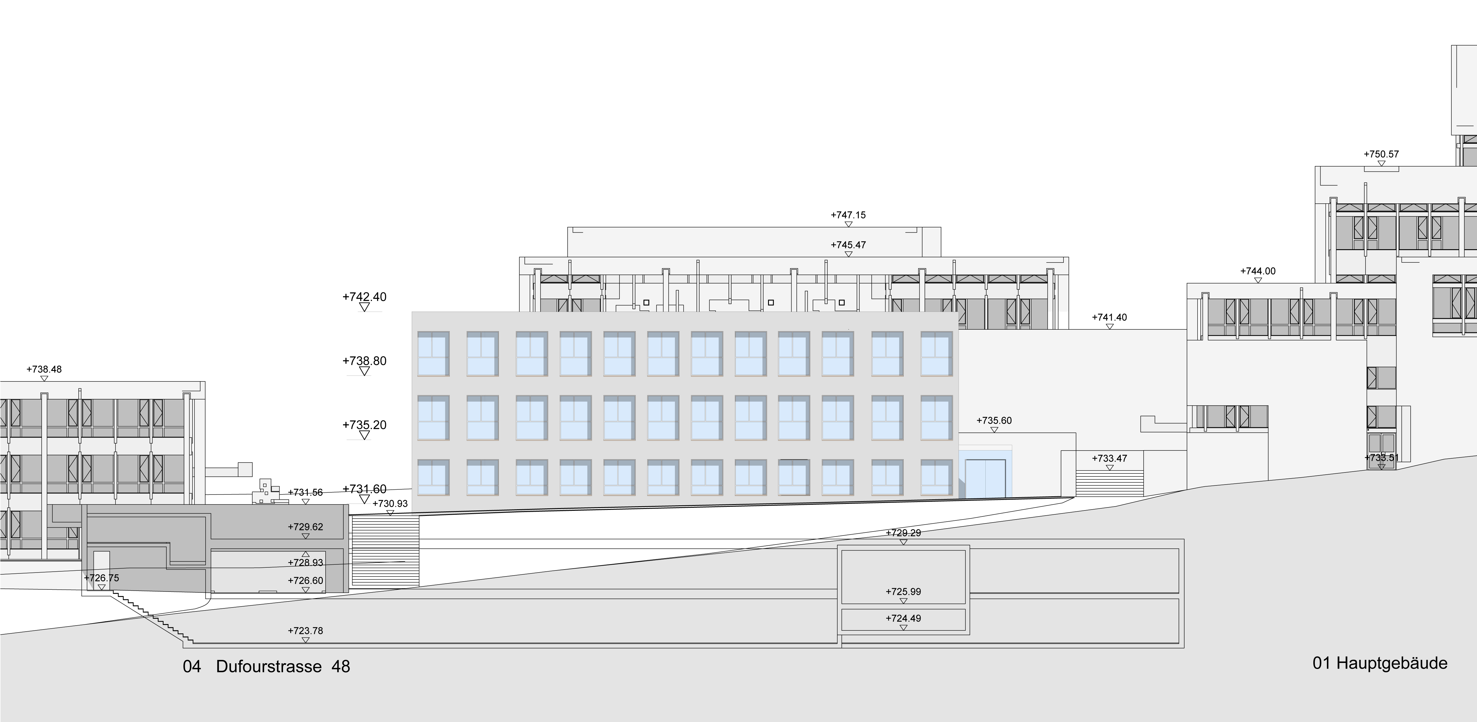 Die vorgeschlagene Erweiterung der Universititätsgebäude um weitere Räumlichkeiten für die Lehre und Verwaltung, Archive, Lager, einer neuen, gedeckten Parkierungsanlage und vor allem einer umfassenden Neuorientierung der gesamten Erschliessung, stützt sich auf das, von der Universitätsleitung in Zusammenarbeit mit Baufachleuten, prozessartig entwickelte Konzept.