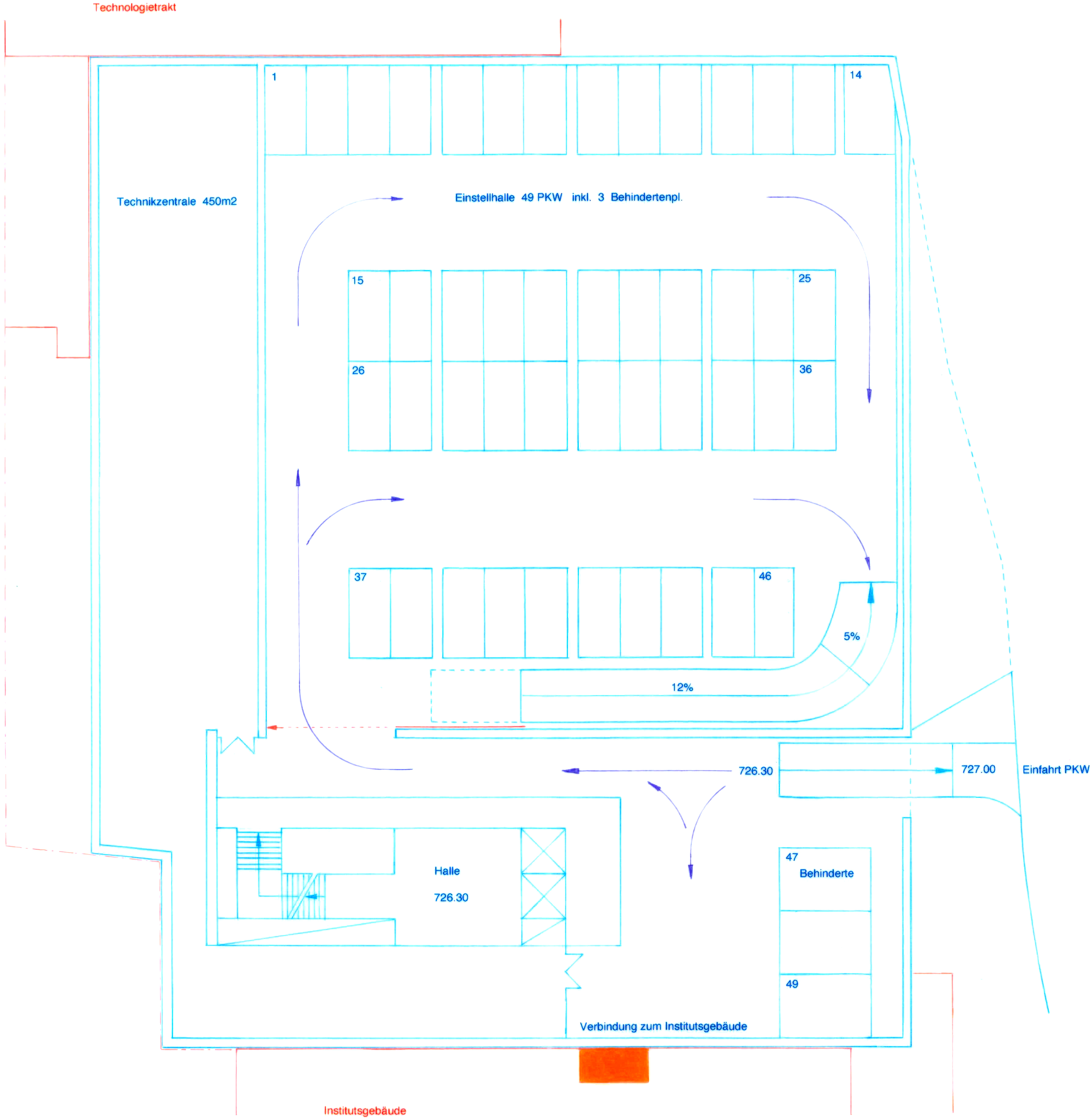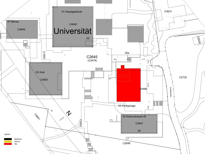 “Ein neuer Seminartrakt im Südosten des bestehenden Universitätscampus soll Raum bieten für zusätzliche Lehrräume und Verwaltungsbüros, sowie einen zweiten wichtigen Zugang zum Hauptgebäude der Universität aus südöstlicher Richtung schaffen. Ausserdem soll eine neue Einstellhalle die beiden bisherigen, offenen, Parkplätze ersetzen” – Auszug aus dem Programm