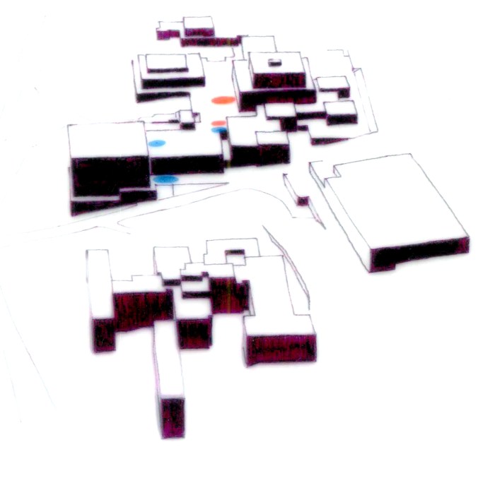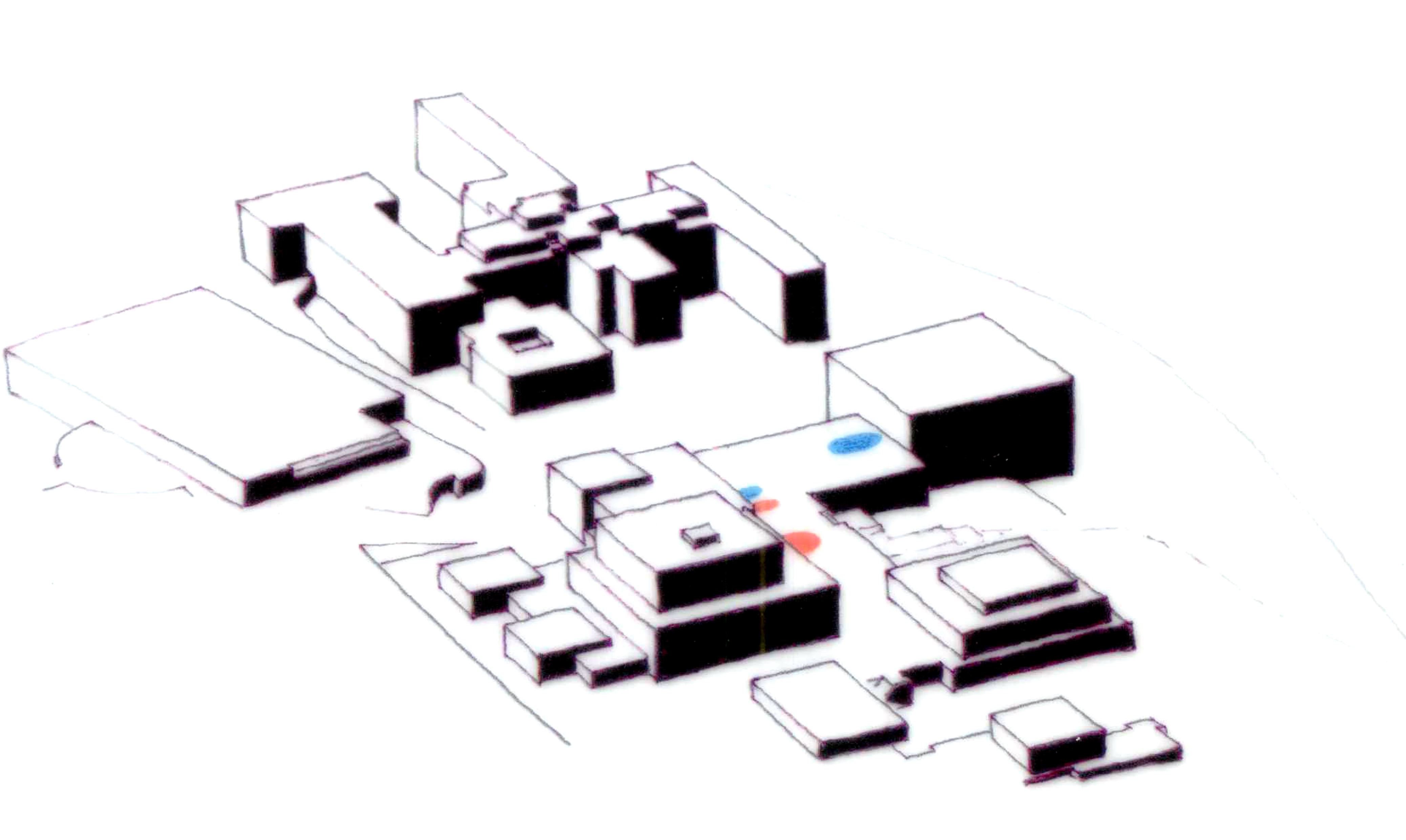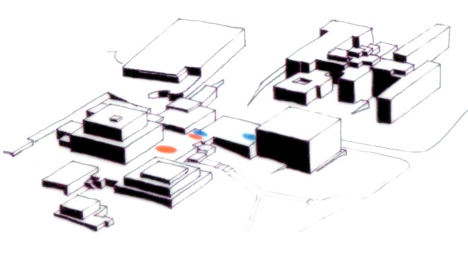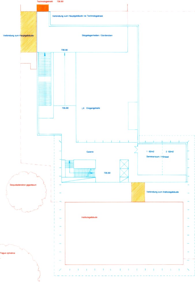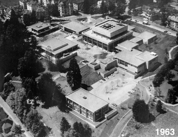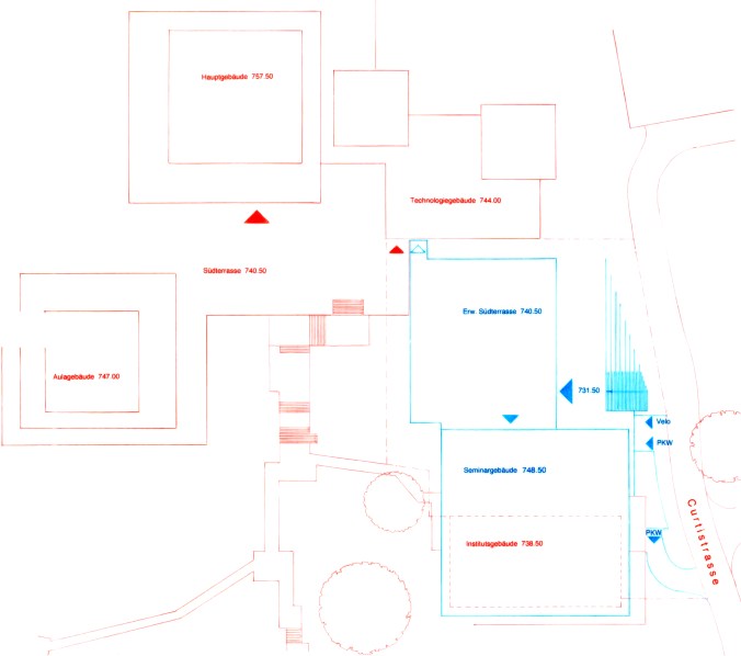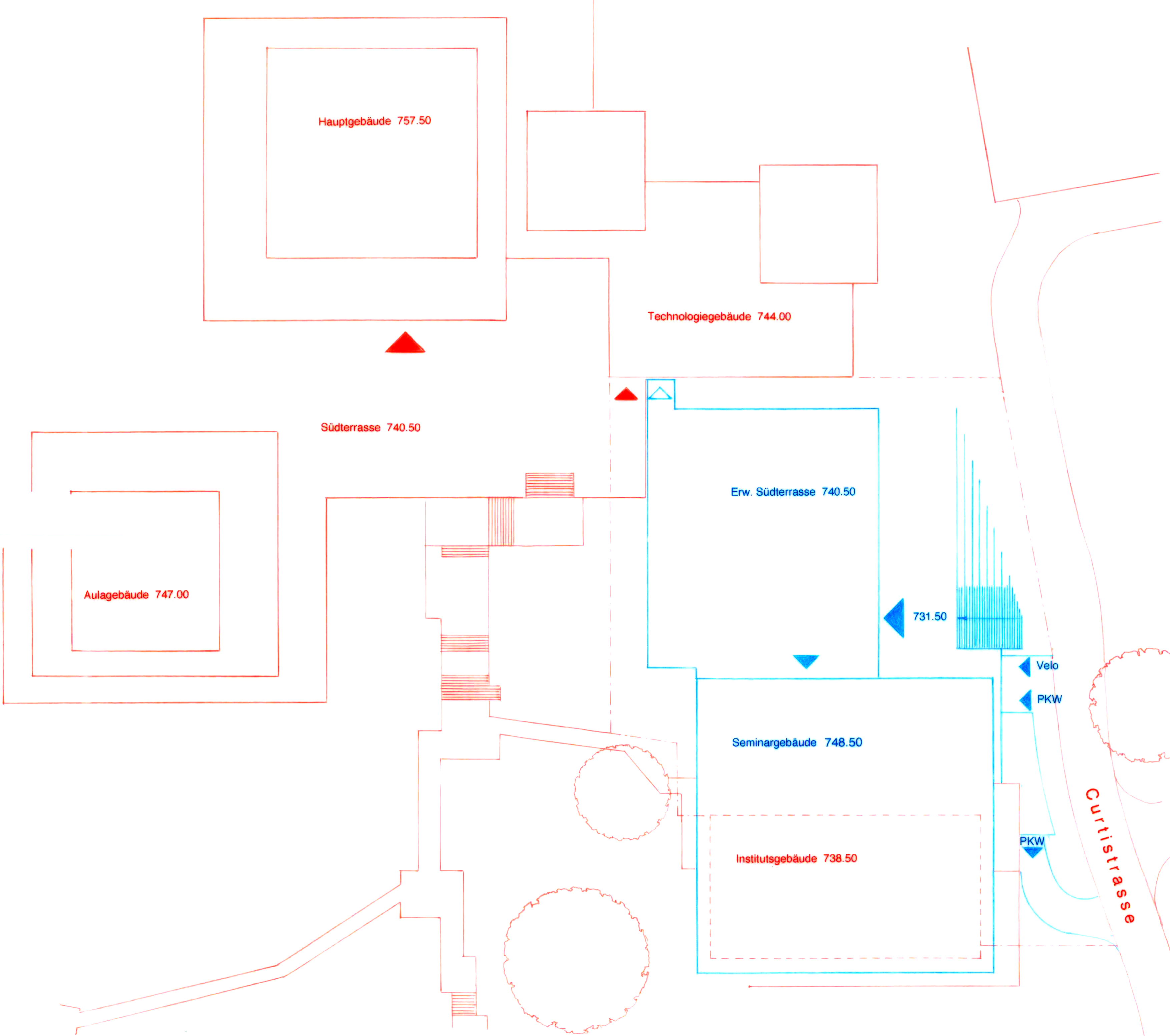 Städtebauliche Überlegungen – 1) die, gegenüber 1963, sich erheblich veränderte Umgebung des Uni-Geländes durch den Bau des “Helvetia-Patria” Gebäudes und dessen kürzlich realisierte Erweiterung; 2) das Prinzip der “inneren Verdichtung” bei gleichzeitiger Respektierung und Erweiterung der vorhandenen “Terrassenanlagen” und der Wahrung gebührender Abstände zu den bestehenden Baukörpern der Universität; 3) die Platzierung des zukünftigen “ersten Haupteingangs” an der Curtistrasse; – sind die drei wichtigsten Gründe für die “Standortwahl” für das neu geplante Seminargebäude. Also Gegengewicht zum “Hevetia-Patria” Komplex, grösstmögliche Rücksichtnahme auf die Konfiguration des vorhandenen Uni-Ensemble’s, Wegweiser zum neue geplanten Haupteingang und angemessene Geste, die Bedeutung der Universität städtebaulich hervorzuheben.