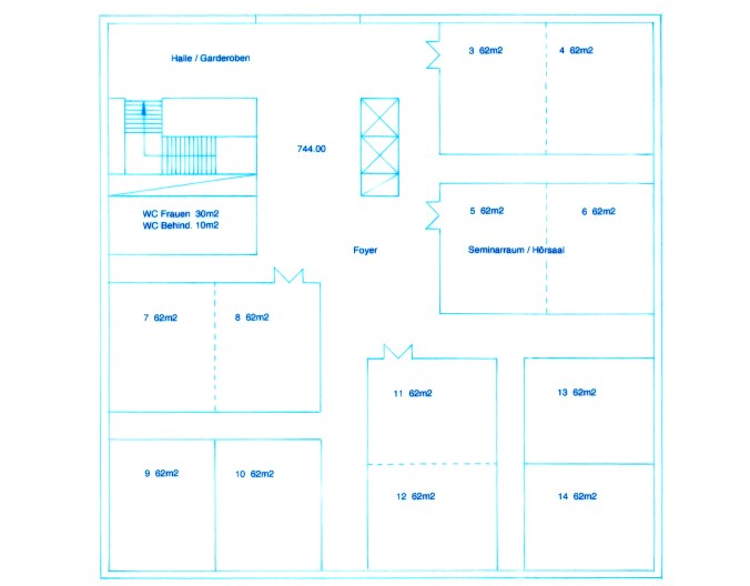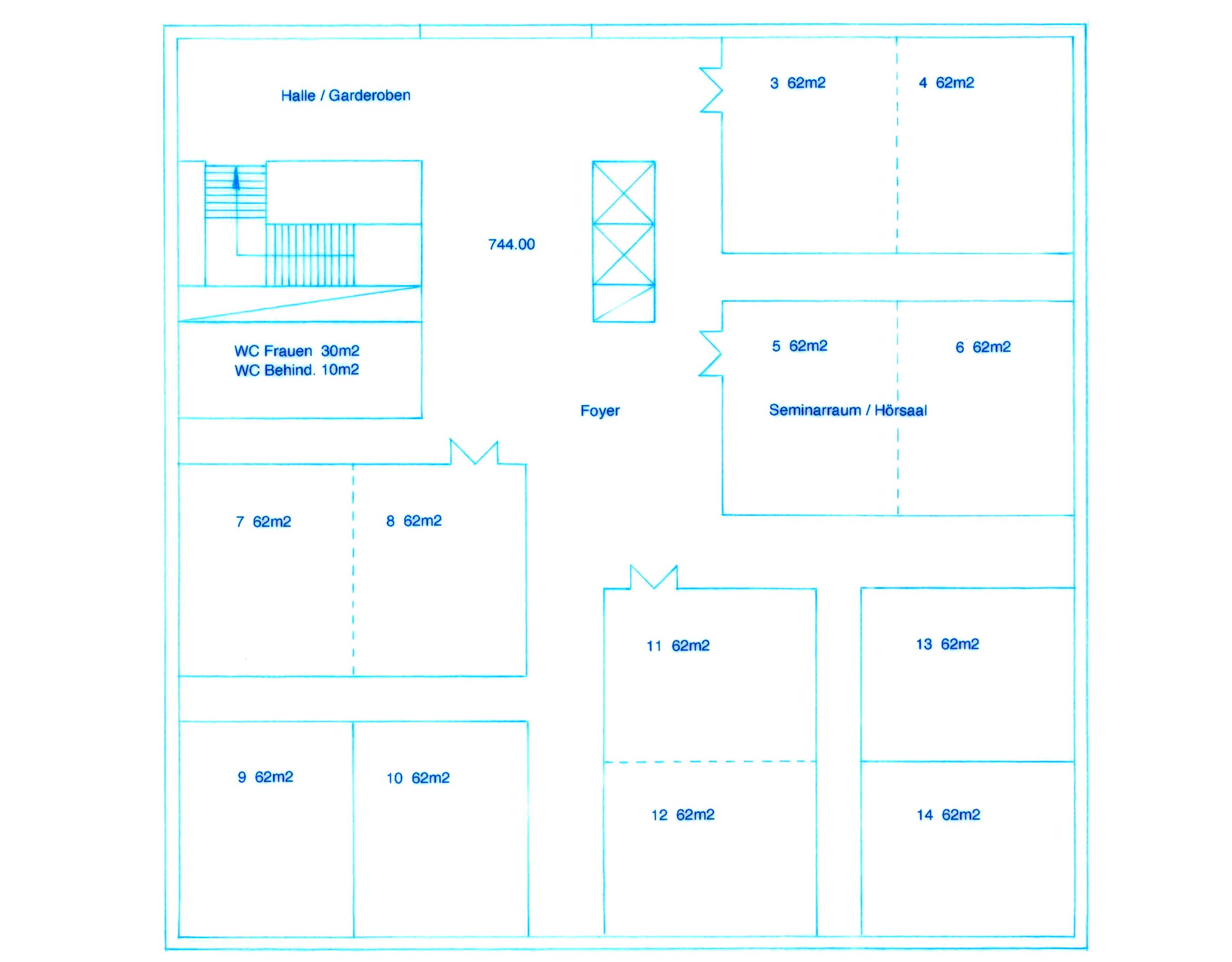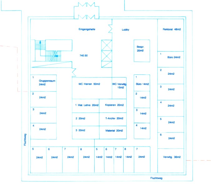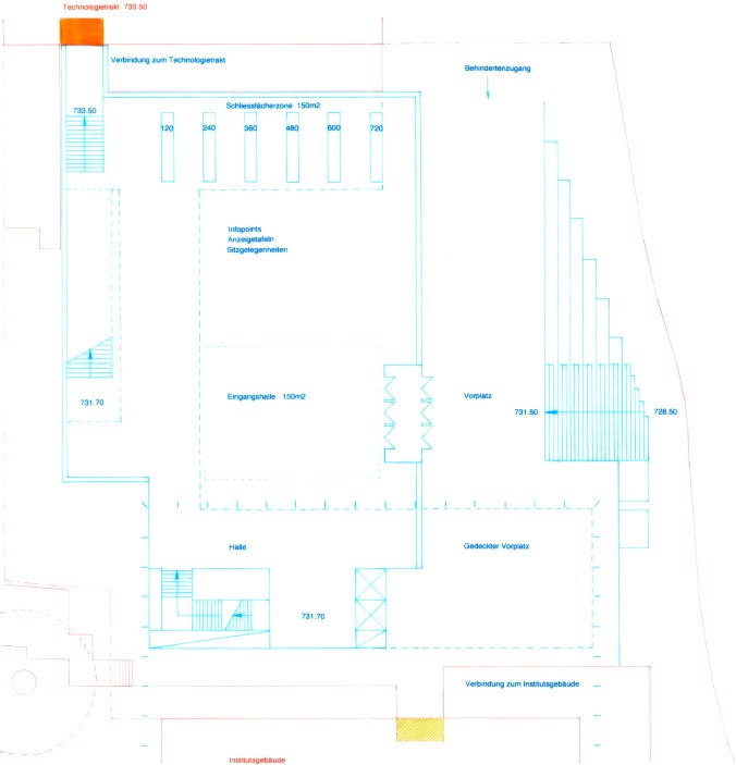 Grossen Wert wird auf die Dimensionierung und Zuordnung der neu geplanten “kollektiven Räume” gelegt; das sind der Zugang über den Aufgang von der Curtistrasse über den neuen Vorplatz zur neuen, grosszügigen, Eingangshalle mit ihren internen Erschliessungsebenen und die Erweiterung der vorhandenen Terrassenanlage mit ihren neuen externen Verbindungen zum vorhandenen Hauptgebäude und den übrigen Bauten, aber auch die erweiterbaren Seminarräume mit Foyer und Vorplätzen.
