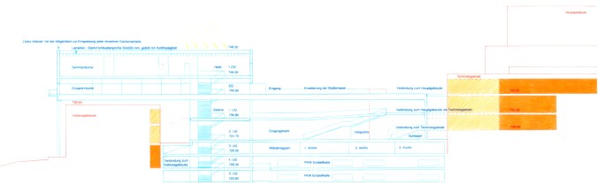 Nord-Ost Ansicht – links das neue Seminargebäude, in der Mitte der neue Hauptzugang