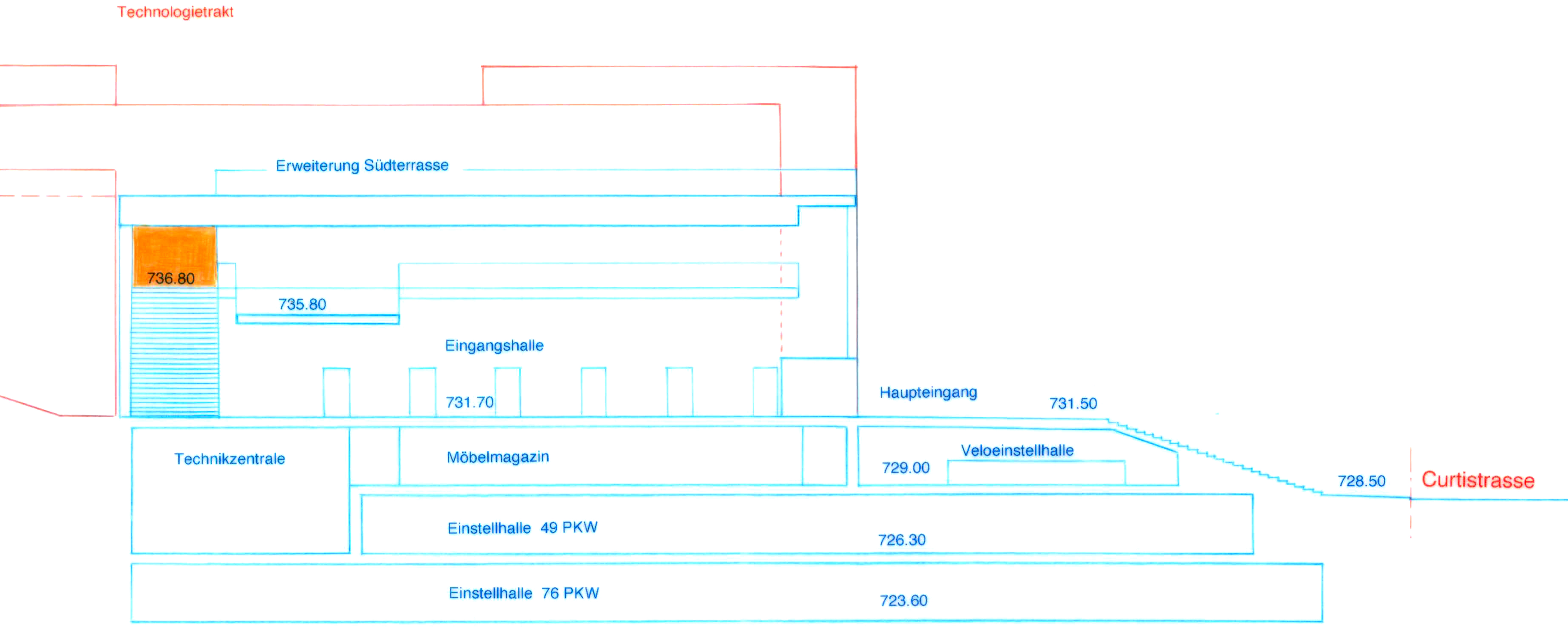 Nicht weniger wichtig war uns auch eine gute Ordnung “rund ums Haus”. Kurze und übersichtliche Zu- und Wegfahrten zur PKW-Einstellhalle von und zur Curtistrasse, gedeckte und natürlich belichtete (durch in der Decke eingelassene Glaslinsen) Veloabstellplätze unter dem Vorplatz zum neu geplanten Haupteingang, sowie die sorgfältige Anpassung der neu geplanten Gebäude an die vorgefundene “Kunstlandschaft” auf der SW-Seite.