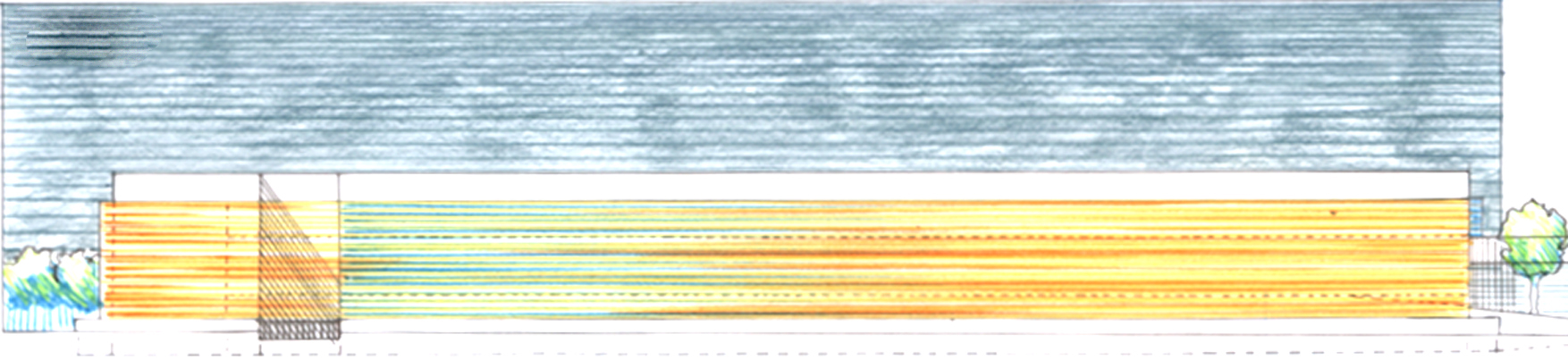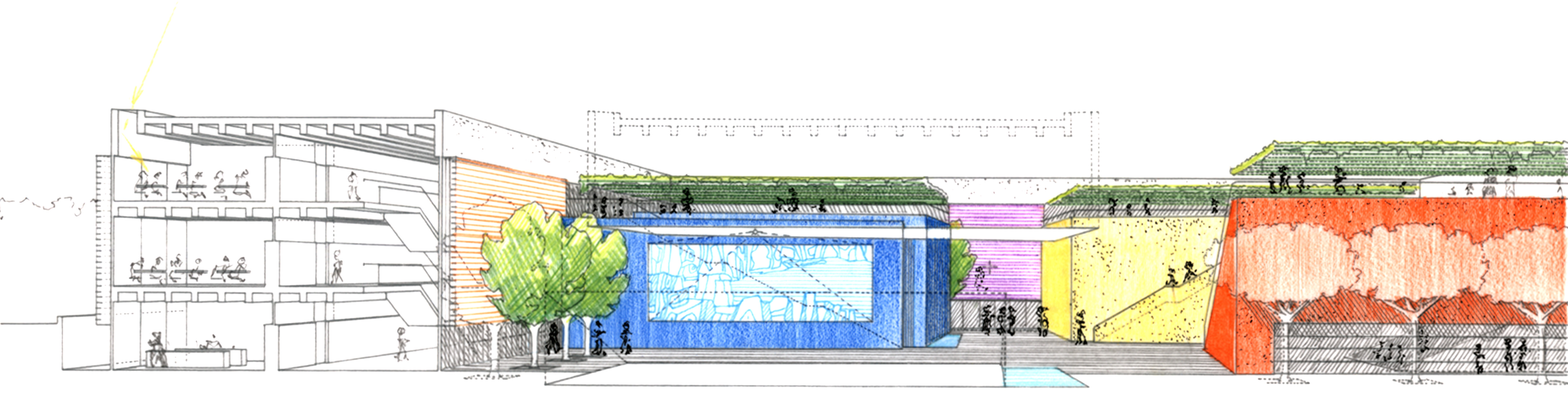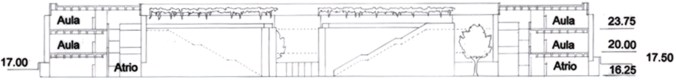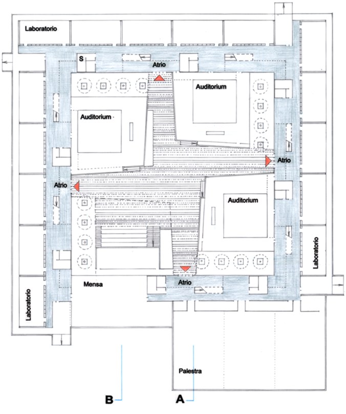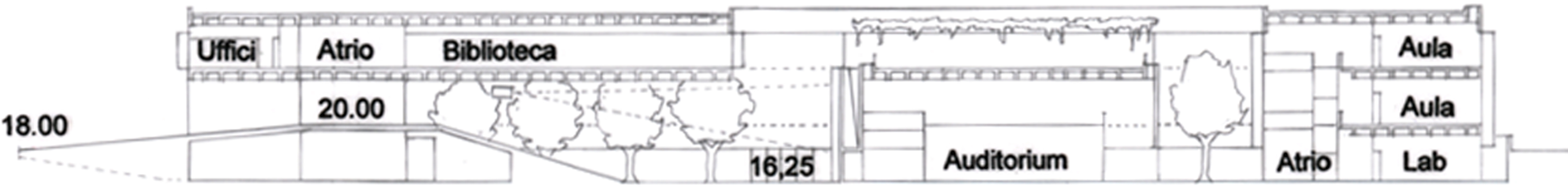 – Sezionare orizzontalmente la volumetria della biblioteca e della mensa per creare l’accesso alla piazza mediante una rampa d’ingresso principale ed una cavea; ciò genera una modulazione sensoriale di percezione degli spazi e dei volumi, per ch accede da tale ingresso, rompendo la monotonia dell’ambiente esterno.