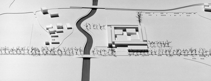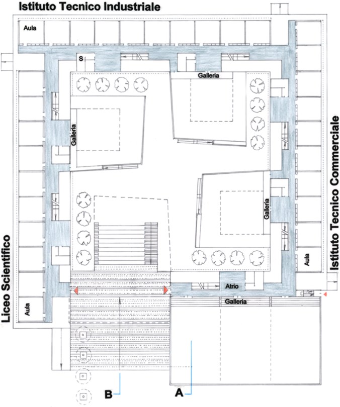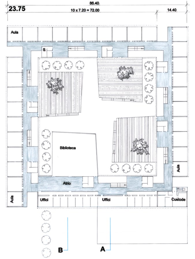 – Ragruppare i quattro elementi della composizione (le tre scuole ed il complesso uffici-mensa-palestra) attorno ad una piazza quadrata; ciò conferisce alla composizione quelle caratteristiche di “introflessione” che appare anche ottimale ai fini della tranquillità e della concentrazione degli studenti.
