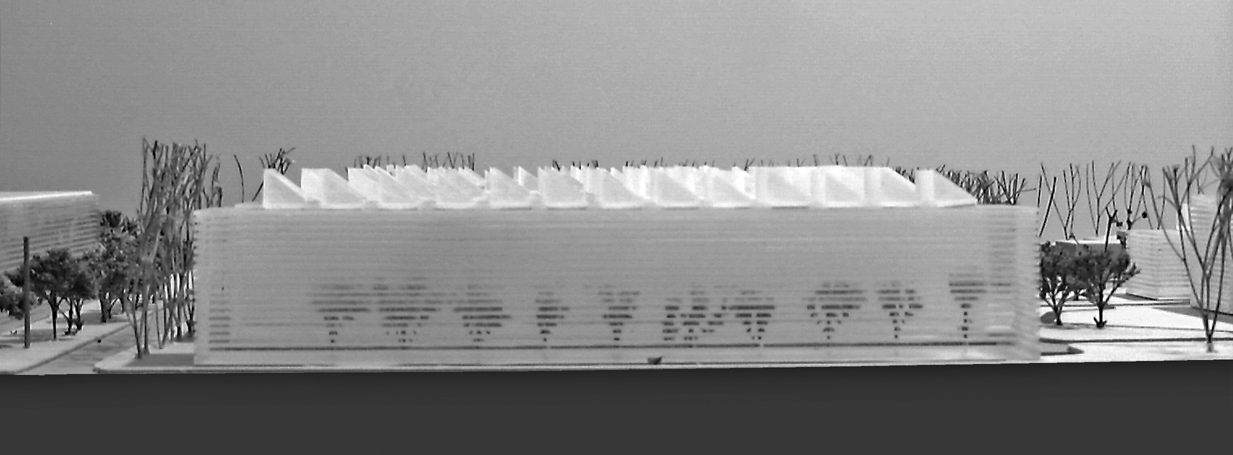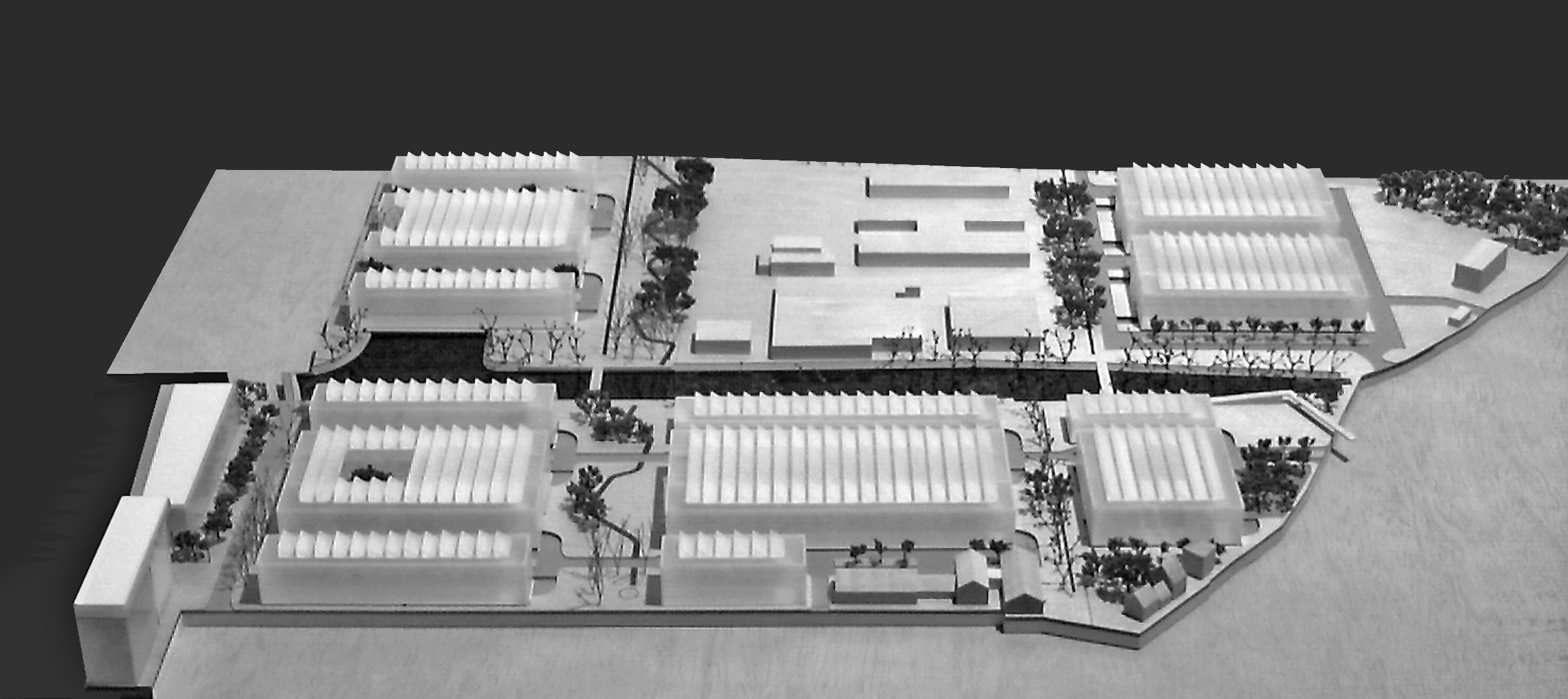 Der gewälte Gebäudetyp weist eine Tiefe von 22.50m, eien Höhe von exact 20.00m und ist in der Länge variabel. In der Regel sind die Gebäude viergeschossig: Das Erdgeschoss mit einer Stockwerkshöhe von 6.00m, 4.00m das erste Obergeschoss, 5.00m das zweite und 5.00m das dritte Obergeschoss. Das Dach ist ein ‘Licht- und Energiekraftwerk’, d.h. Sheds zur Tageslichtnutzung und gleichzeitig Träger von Solarzellen; der verbleibende Dachanteil ist begrünt. Die Tragstruktur der Gebäude in Stahlbeton und Stahl ist vorfabriziert. Die Aussenwände sind vollständig in transluzenter Wärmedämmung ausgeführt. Transparente Verglasungen gegen Aussen sind auf das Notwendigste reduziert. Gegen übermässiges Aufheizen im Sommer schützen Kletterpflanzen die Fassaden vor direkter Sonneneinstrahlung.