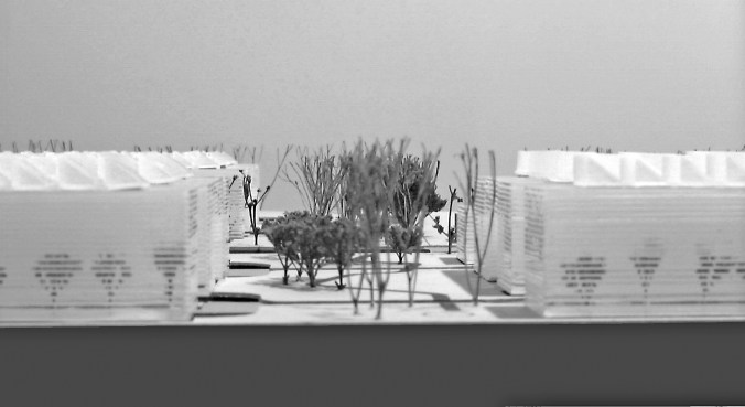 Es sind nüchterne und gleichzeitig elegante Gebäude, die für die Wahrnehmung des Unerprobten und Unbekannten (Forschung) aufrütteln sollen. Die scharfkantigen Volumen sind, bewusst, in Kontrast zu der sie umgebenden Natur gesetzt, um ihre eigene, abgeschlossene Identität zu schaffen. Wir schlagen vor, jeweils zwei ‘Science Blöcke’ zu einem Atriumgebäude zusammenzufassen. Neben den bekannten Vorteilen dieses Gebäudetyps: Belebte Verkehrsflächen, die der Kommunikation dienen; eigene Klimazone zwischen Innen und Aussen; usw., liefert er den Wiedererkennungsfaktor und den Öffentlichkeitswert, welcher Besucher anzieht und der Vermarktung nützt. Es wird der Eindruck vermittelt, man gerate wie ‘Alice im Wunderland’ in eine Welt, die mit der draussen in keinerlei Zusammenhang steht, die aller ‘Unordnung’ und Bezüge entkleidet ist, eine Welt ‘spartanischer’ Grundthemen.