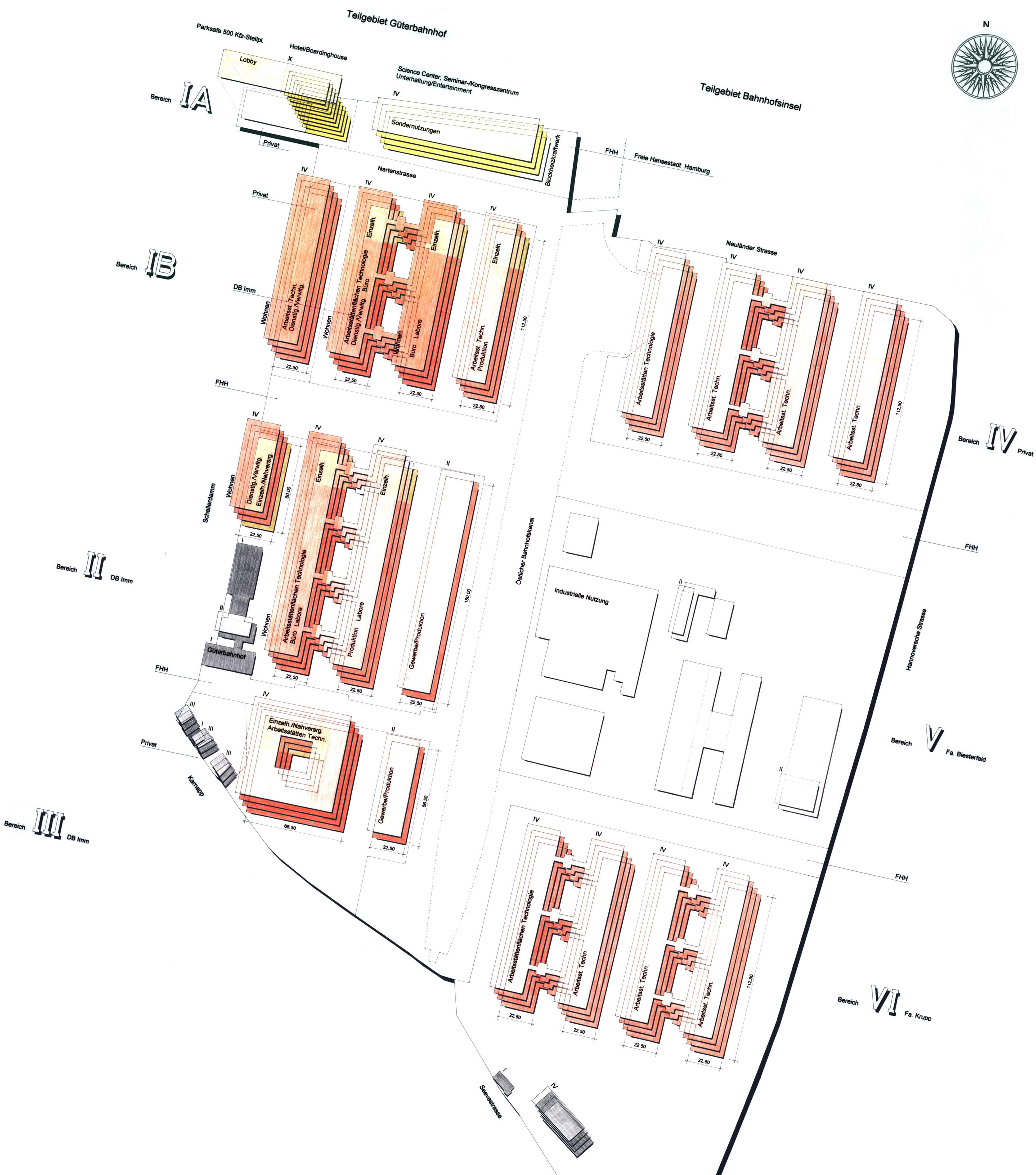 Der Entwurf hält sich im Wesentlichen an den Bebauungsplan Harburg 59 und integriert die, in den WorkShops erarbeiteten, Szenarien für für nachhaltige Entwicklung des Güterbahnhof- und des Bahnhofinselgeländes.