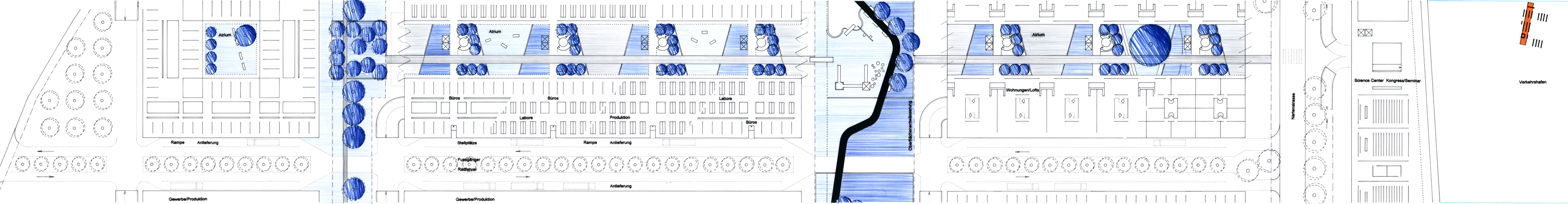 Grundriss Ausschnitt, Nord-Süd, ‘Science Blöcke’ und Atrien, rechts das Kongresszentrum