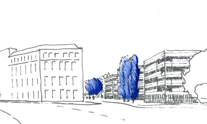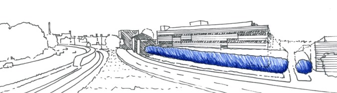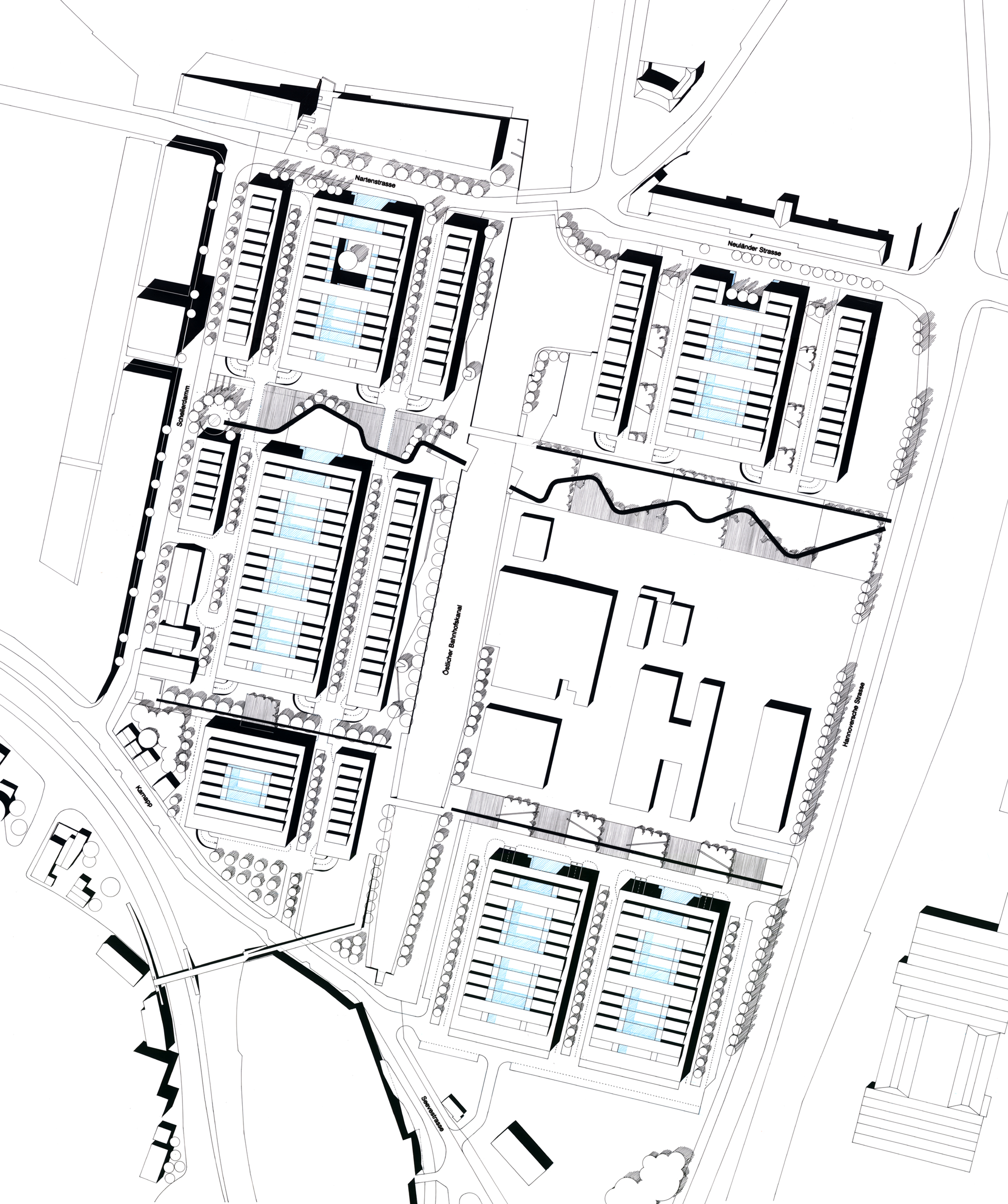 Östlich Schellerdamm: Die Nord-Süd Ausrichtung der neuen Bebauung folgt der heute noch zum Teil vorhandenen Gleisstruktur und soll zusammen mit der historischen Gebäudegruppe Bahnhofgebäude Schellerdamm 19/21 und der antriebslosen Drehscheibe, integriert in den neuen Platz, an die ehemalige Nutzung als Harburger Kopfbahnhof erinnern.
