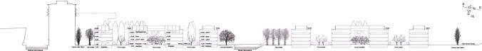 Ansicht C-C, vom Park, Teilgebiet Güterbahnhof links, Bahnhofskanal mitte, Teilgebiet Bahnhofsinsel rechts