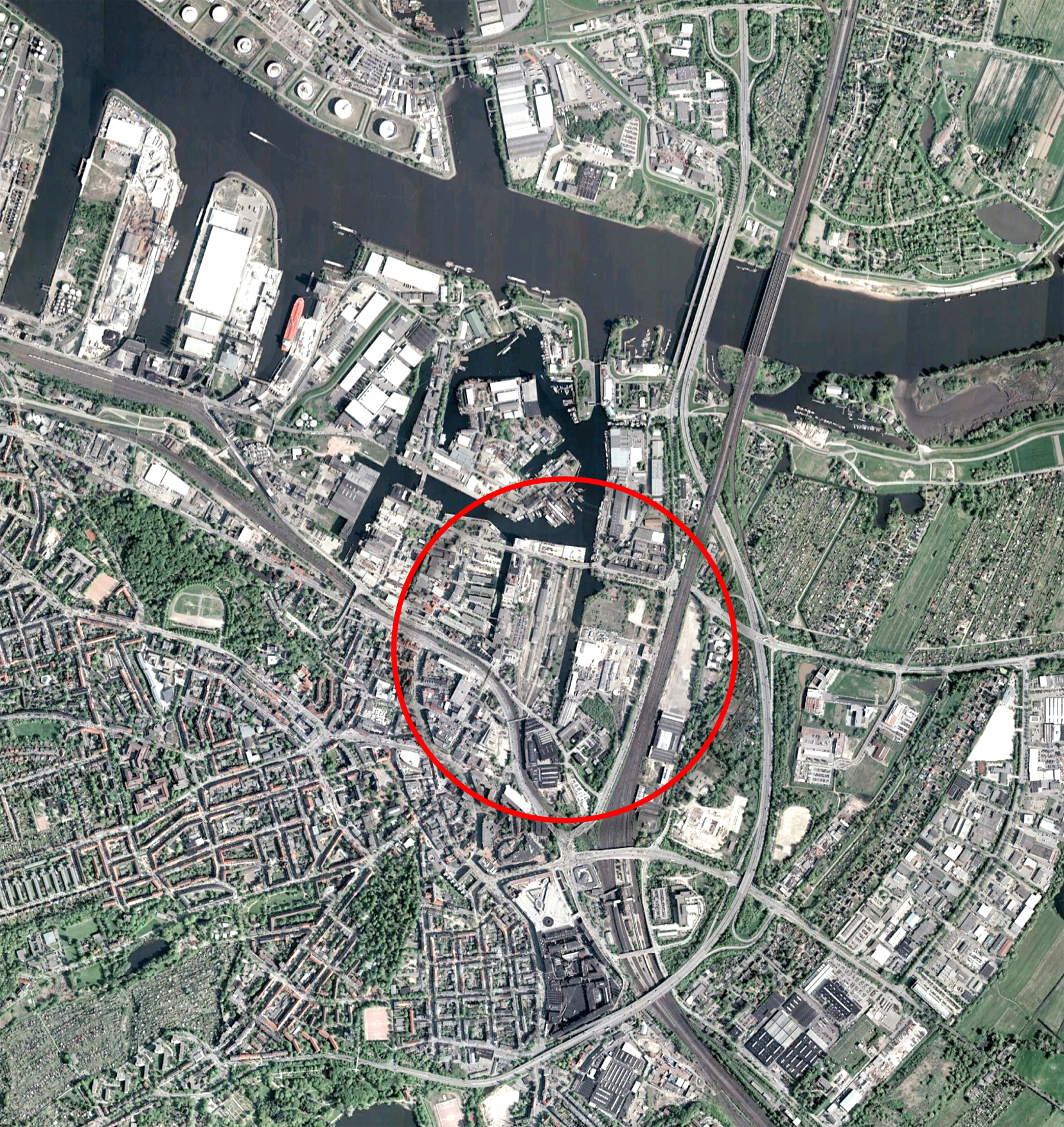 Für eine Fläche von ca. 25 ha, mit direktem Wasserbezug, im Bereich des ehemaligen Hafen- und Industriegebietes soll ein Bebauungs- und Freiraumkonzept entwickelt werden, das den Strukturwandel zielgerichtet vorantreibt. Schwerpunkt ist die Ansiedlung zukunftsorientierter Forschungs- und Technologieeinrichtungen, die sich überlagern mit Kultur, Freizeit sowie Wohnen die ergänzt werden durch die zu integrierenden vorhandenen Produktionsbetriebe.