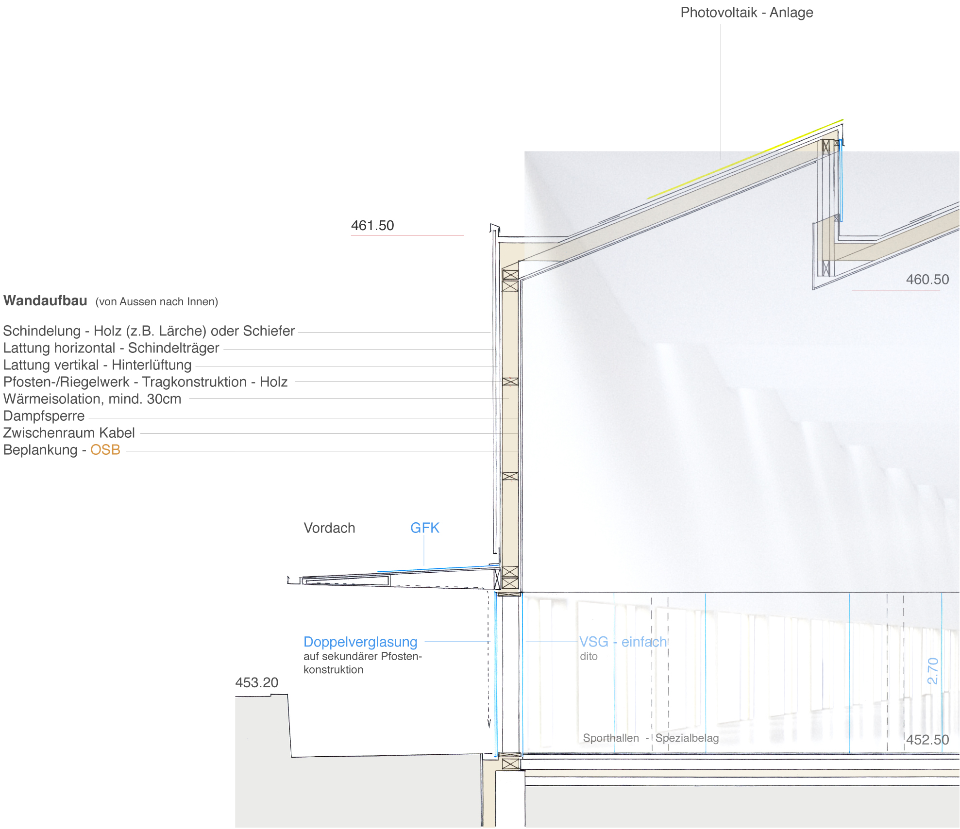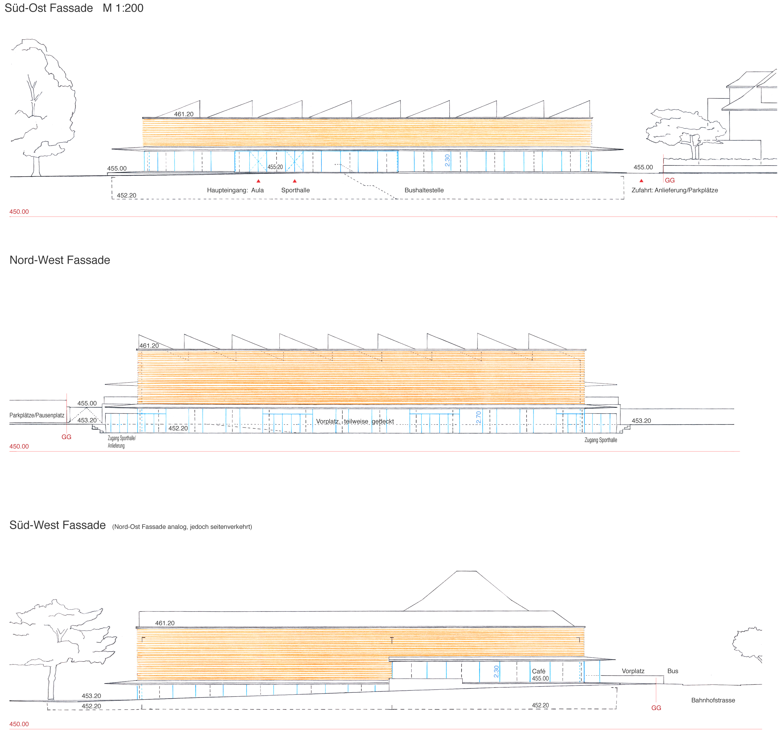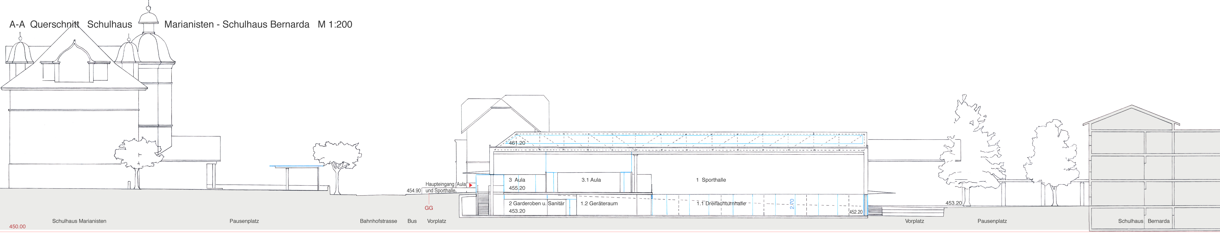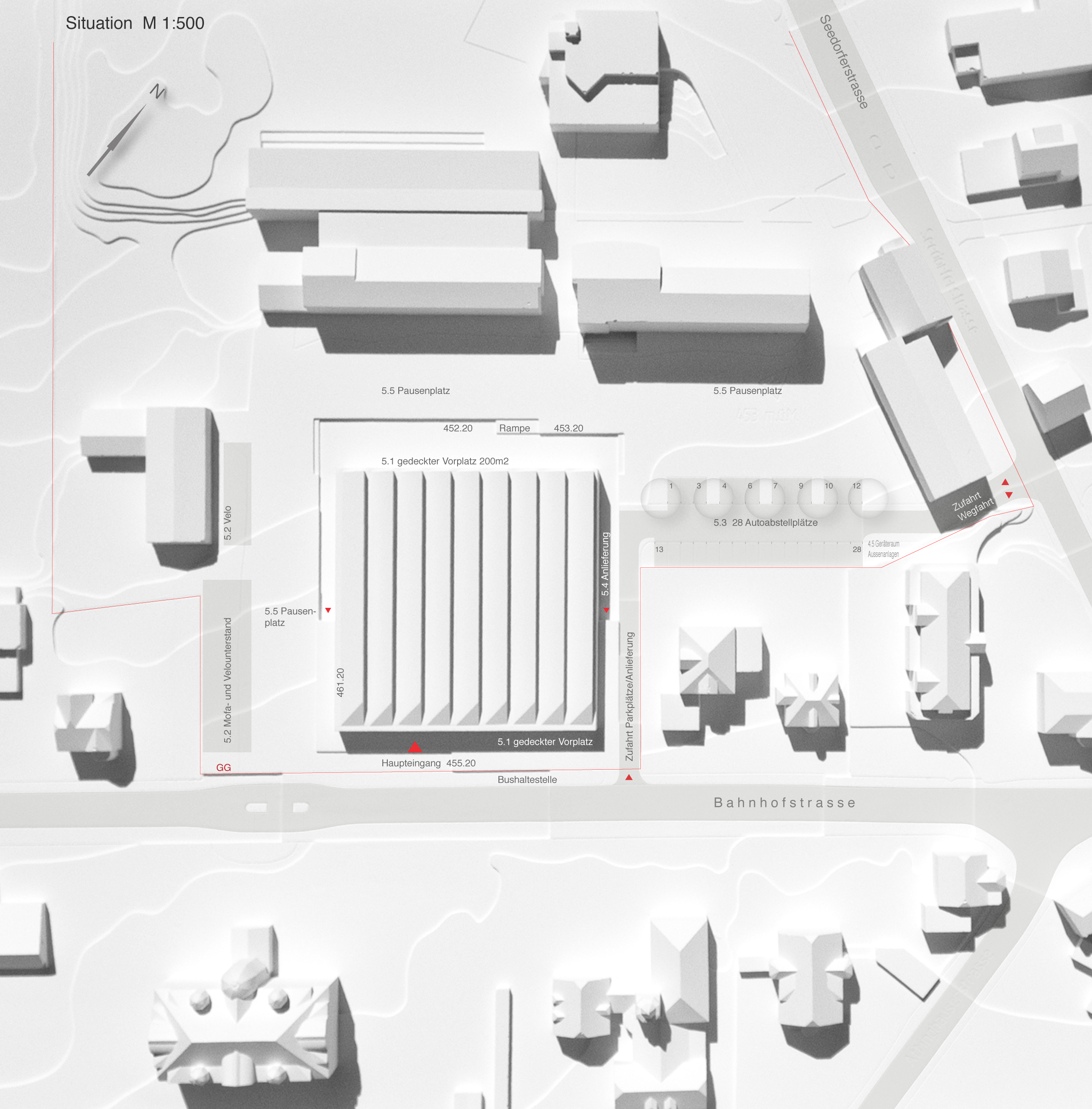 Erschliessung Das neu geplante Gebäude liegt, im Abstand von 4m und in einer Reihe mit den vorhandenen Gebäuden, an der Bahnhofstrasse. Der Haupteingang des ‘Zentrum’s wird über den neuen Vorplatz an der Bahnhofstrasse erreicht. Im transparenten Eingangsgeschoss, Ebene 455.20, befindet sich der Aula-Bereich. Der Sporthallen-Bereich wird durch den Treppenabgang im Windfang betreten. Vom Pausenplatz, Ebene 452.20, wird, auf beiden Längsseiten, die Sporthalle betreten.