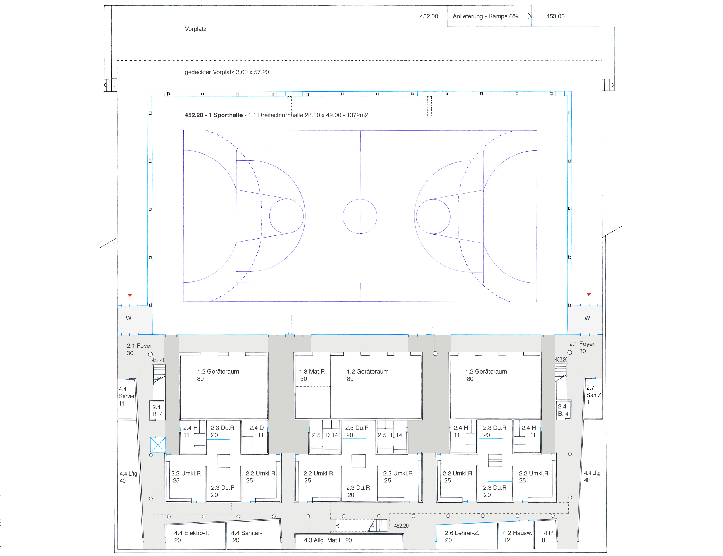 Grundriss Ebene 452.20 – Vorplatz, Sporthalle, Geräte- und Garderobenräume, Serviceräume