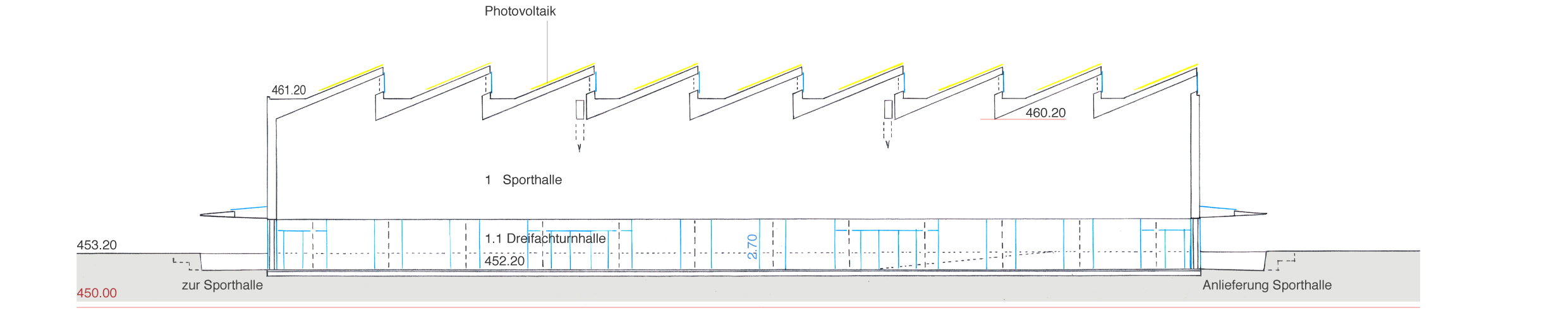 Ebene 452.20 mit der Sporthalle, dem neuen Vorplatz und den dienenden Räumen für den Schul- und Vereinsbetrieb sowie für andere Anlässe unterschiedlichster Art.