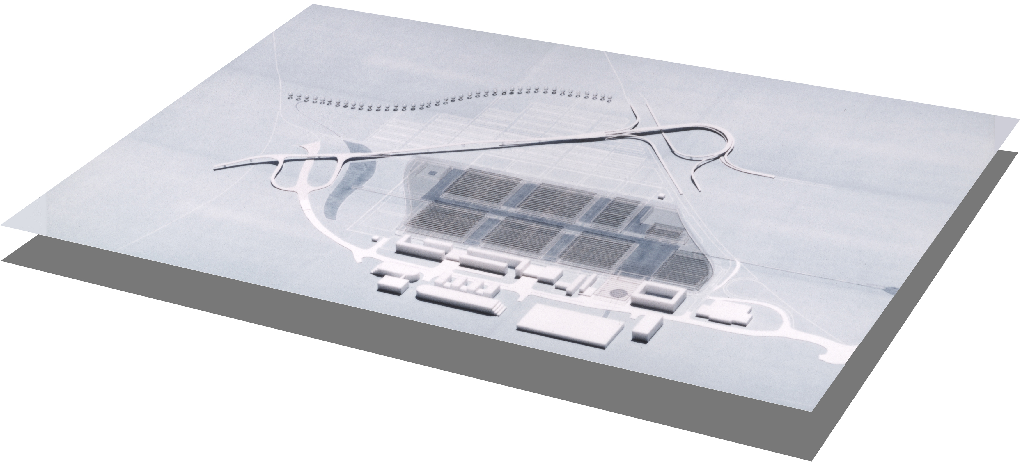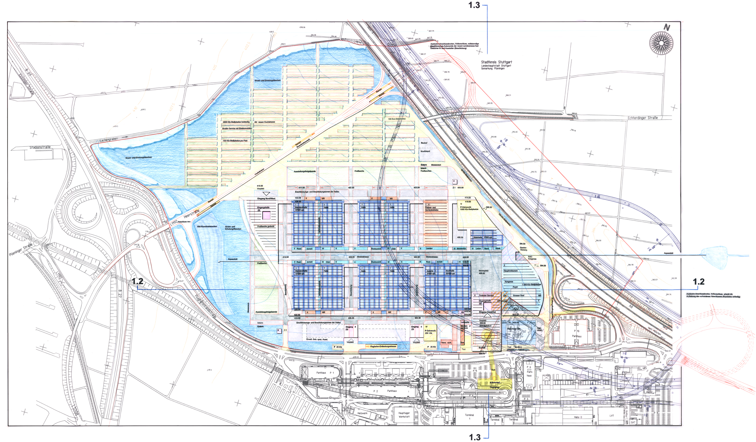 Blick von Ost – die neue Messe nördlich der vorhandenen Service-Gebäude des Fluhafens Stuttgart