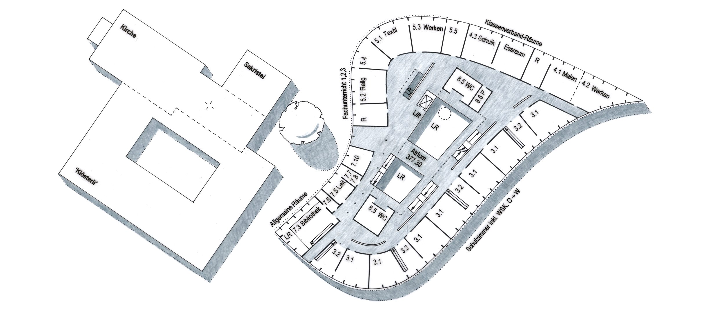 Von der südlichen Gebäudeecke des neuen Schulhauses bewegt sich die Gebäudeflucht zuerst leicht vom gegenüberliegenden Konvent und der Chorfassade der Kirche weg um darauf entschieden in Richtung West abzubiegen. Zusammen mit der neu geplanten Sakristei wird damit der neue Schulhof geschaffen.