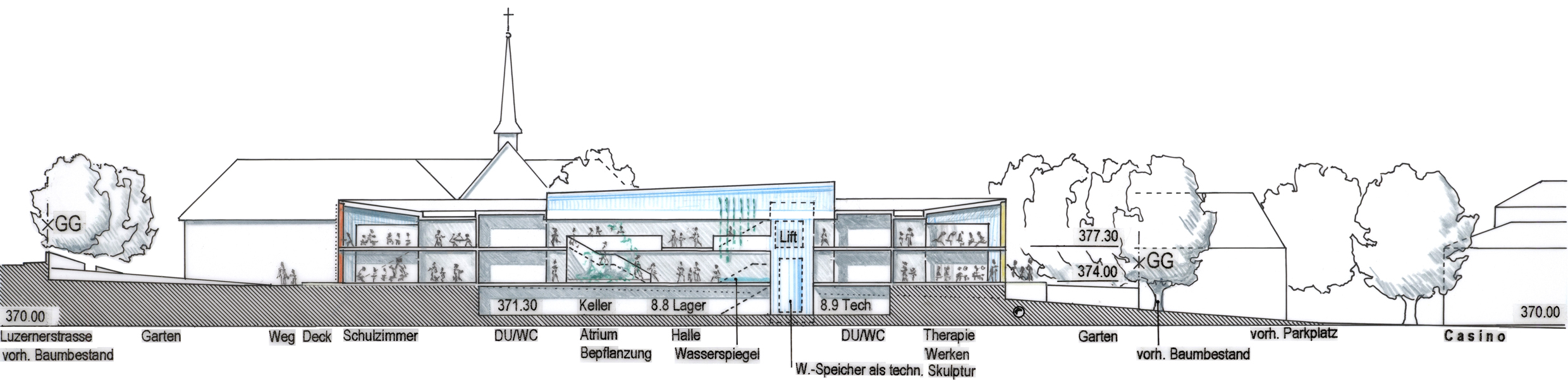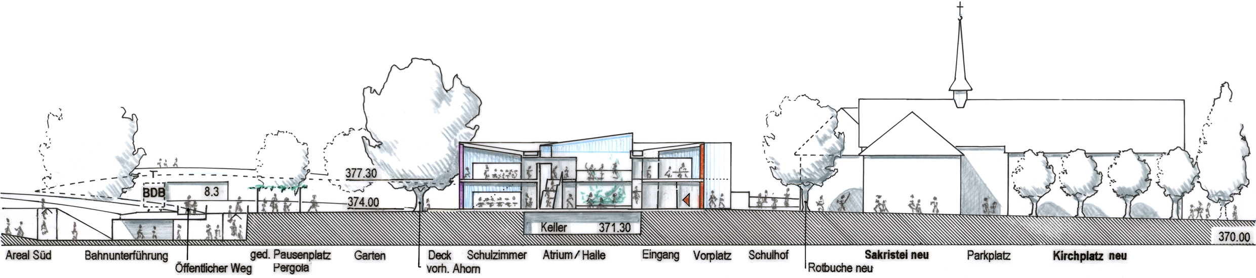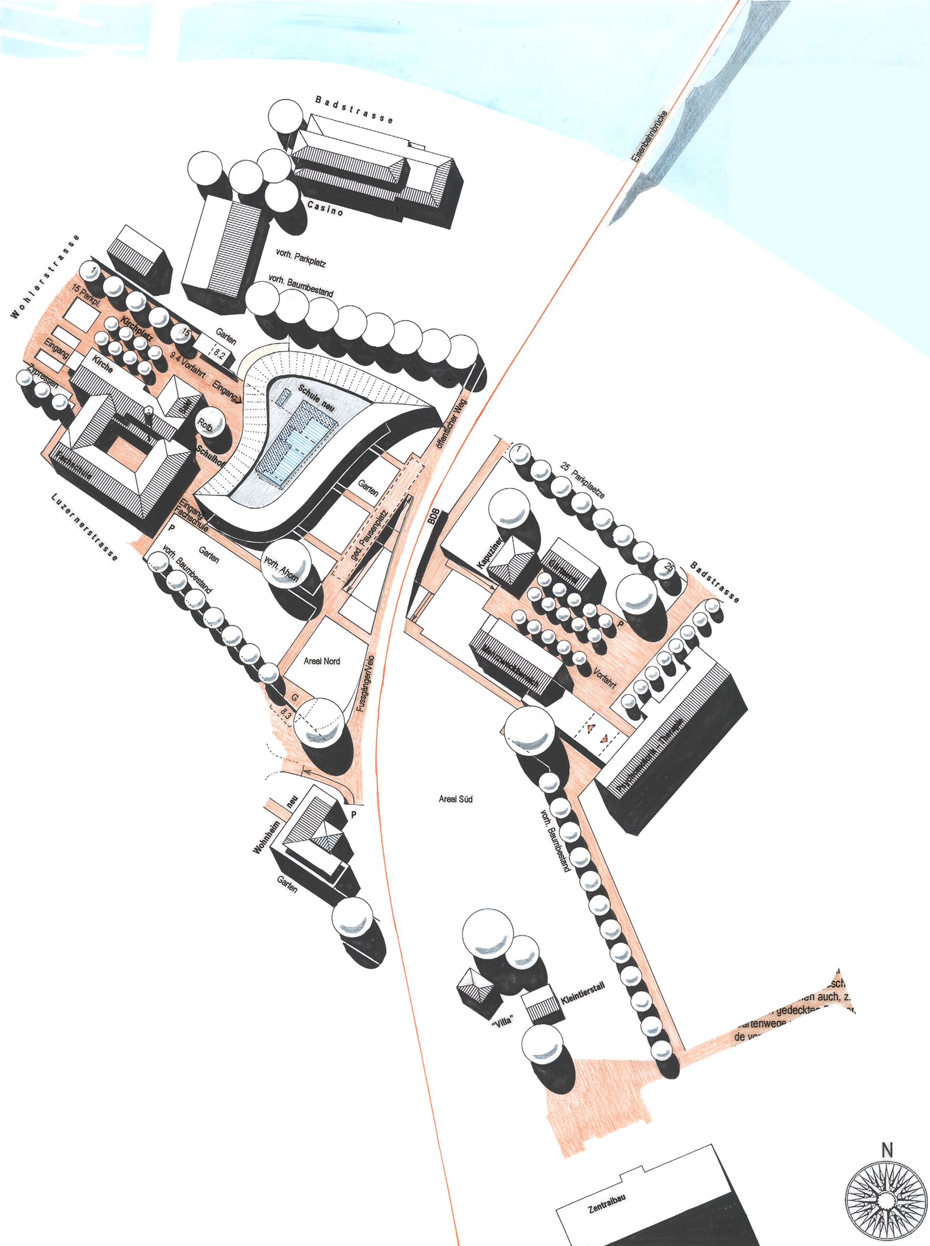 Vom neuen Wohnheim auf Parz.Nr. C313 führt der Schulweg entlang der Bahnlinie aufs Schulgelände. Die Schulzimmer im Erdgeschoss und im Obergeschoss können auch, im Sommerbetrieb, vom gedeckten Pausenplatz her über Gartenwege und die im neuen Schulgebäude vorgeschlagenen, Wintergarten-ähnlichen kleinen Pausenhallen erreicht werden.