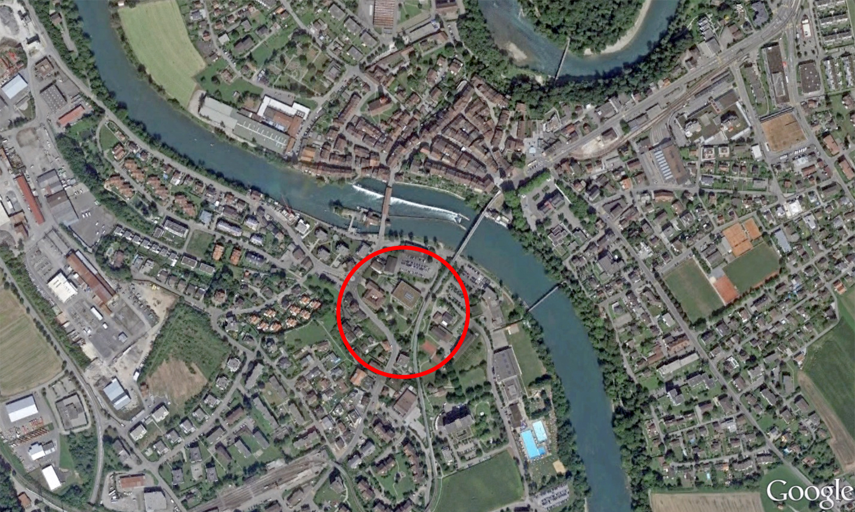 An diesem Punkt dreht sich die Flucht in Richtung Nord, um gleich anschliessend in flacher Krümmung, deren Tangente parallel zur Südfassade des Casino’s liegt, dem vorhandenen Baumbestand entlang, an der nördlichen Gebäudeecke zu enden. Diese zeigt auf das untere Ende der Gleisrampe der BDB, die über die Eisenbahnbrücke seit 1912 zum Obertor führt.