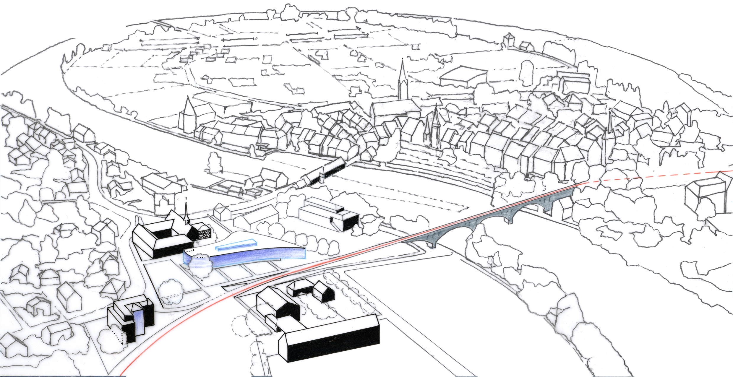 Aus städtebaulicher Sicht ist es die Aufgabe der neu geplanten Schule, neue Beziehungen innerhalb des bestehenden Ensembles zu schaffen – diese Einbettung in die vorhandene Umgebung soll mittels einer unverwechselbaren Form erreicht werden.