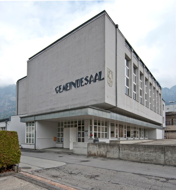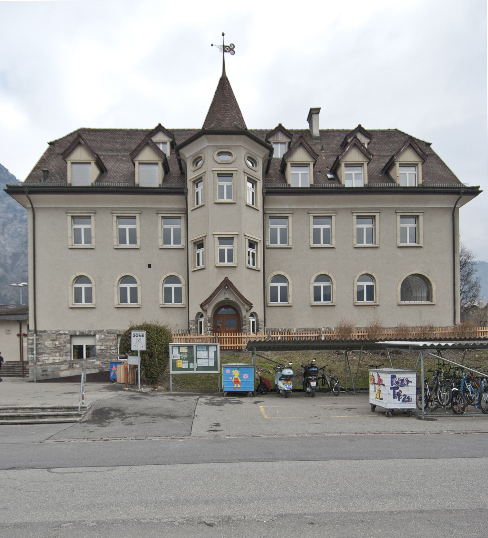 Platz – der Gemeindesaal links, das Schulhaus und das alte Schulhaus