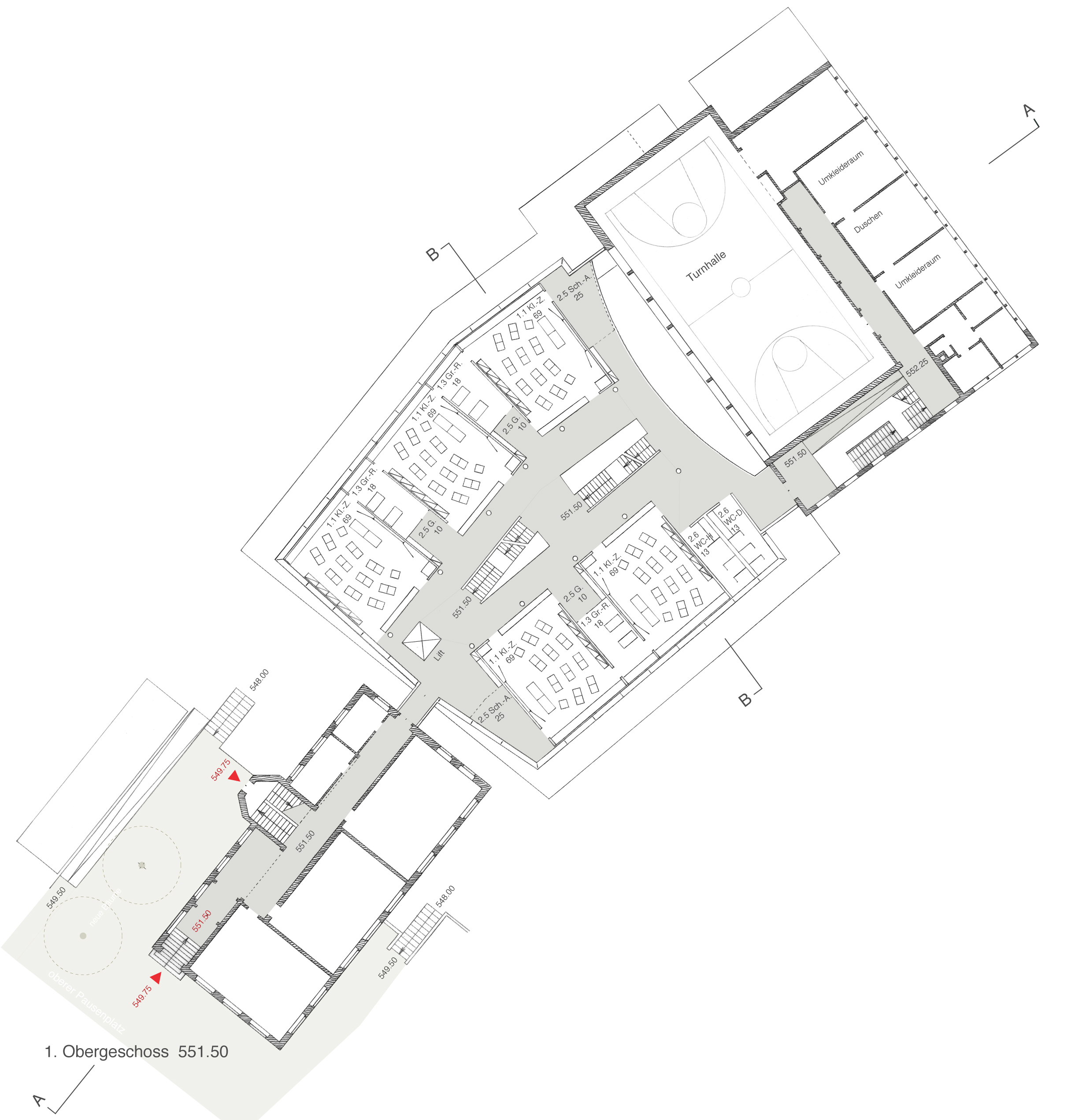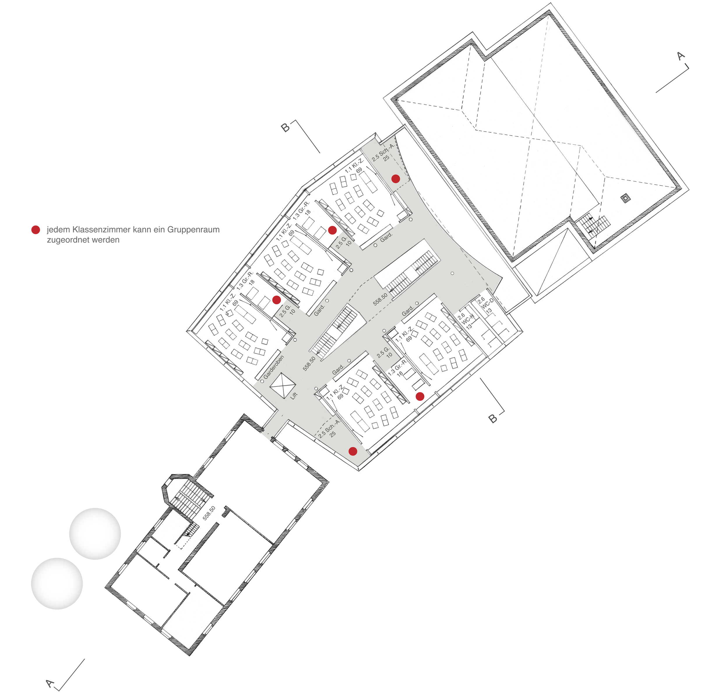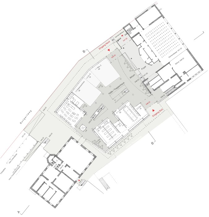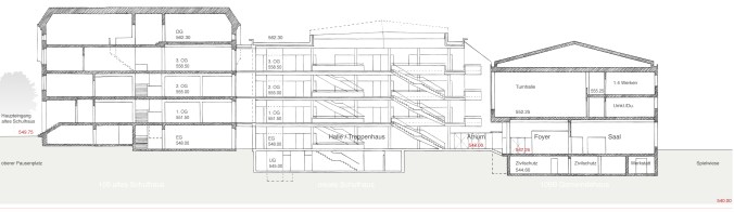 – die Räume der vorhandenen Gebäude ‘verweben’ sich mit den neuen Räumen des geplanten Schulhauses, entlang einer durchgehenden Erschliessungszone: Von den Eingängen und dem Treppenhaus des ‘alten’ Schulhauses über die Hallen-/Treppenhausbereiche und das Atrium des Neubaus bis zum Foyer und den Eingängen und dem Treppenhaus des ‘Gemeindesaal’ Gebäudes.