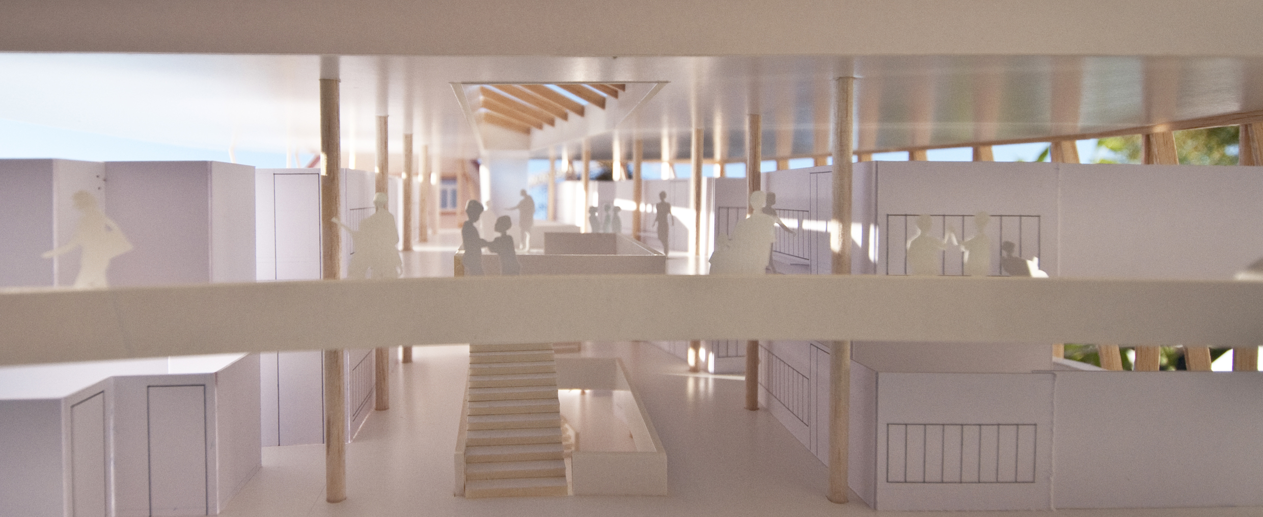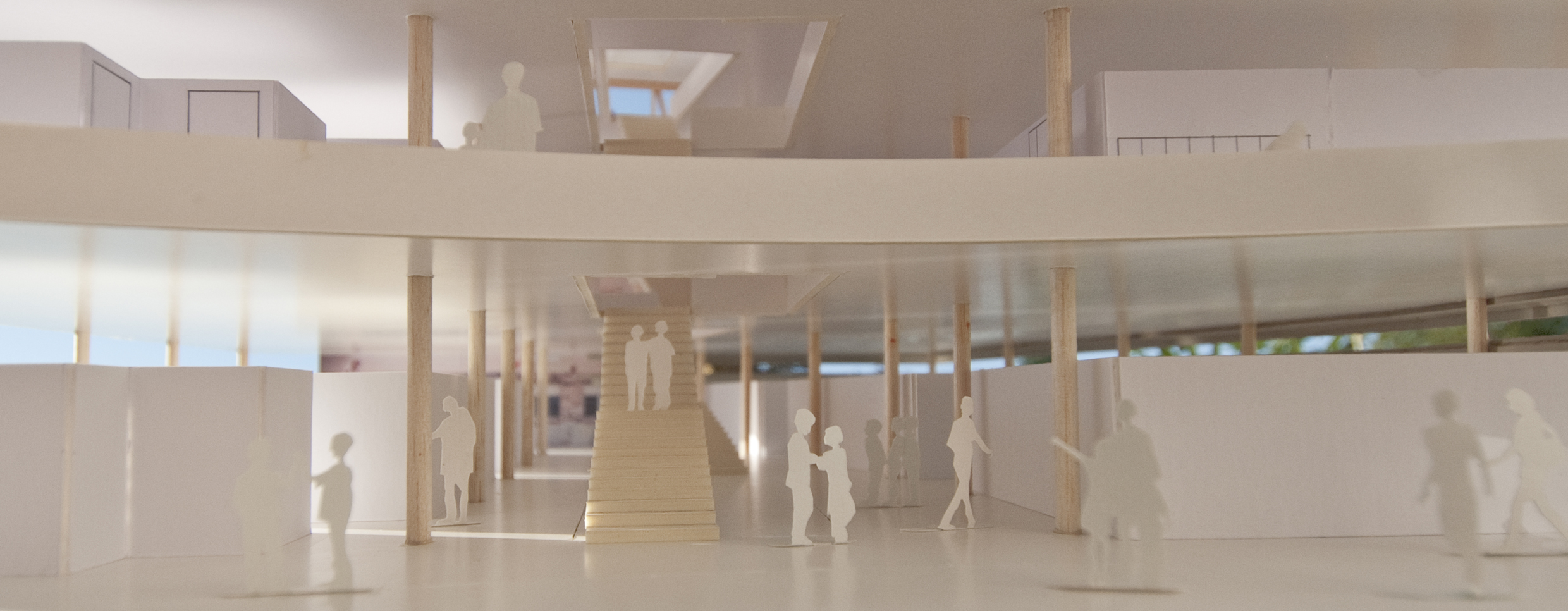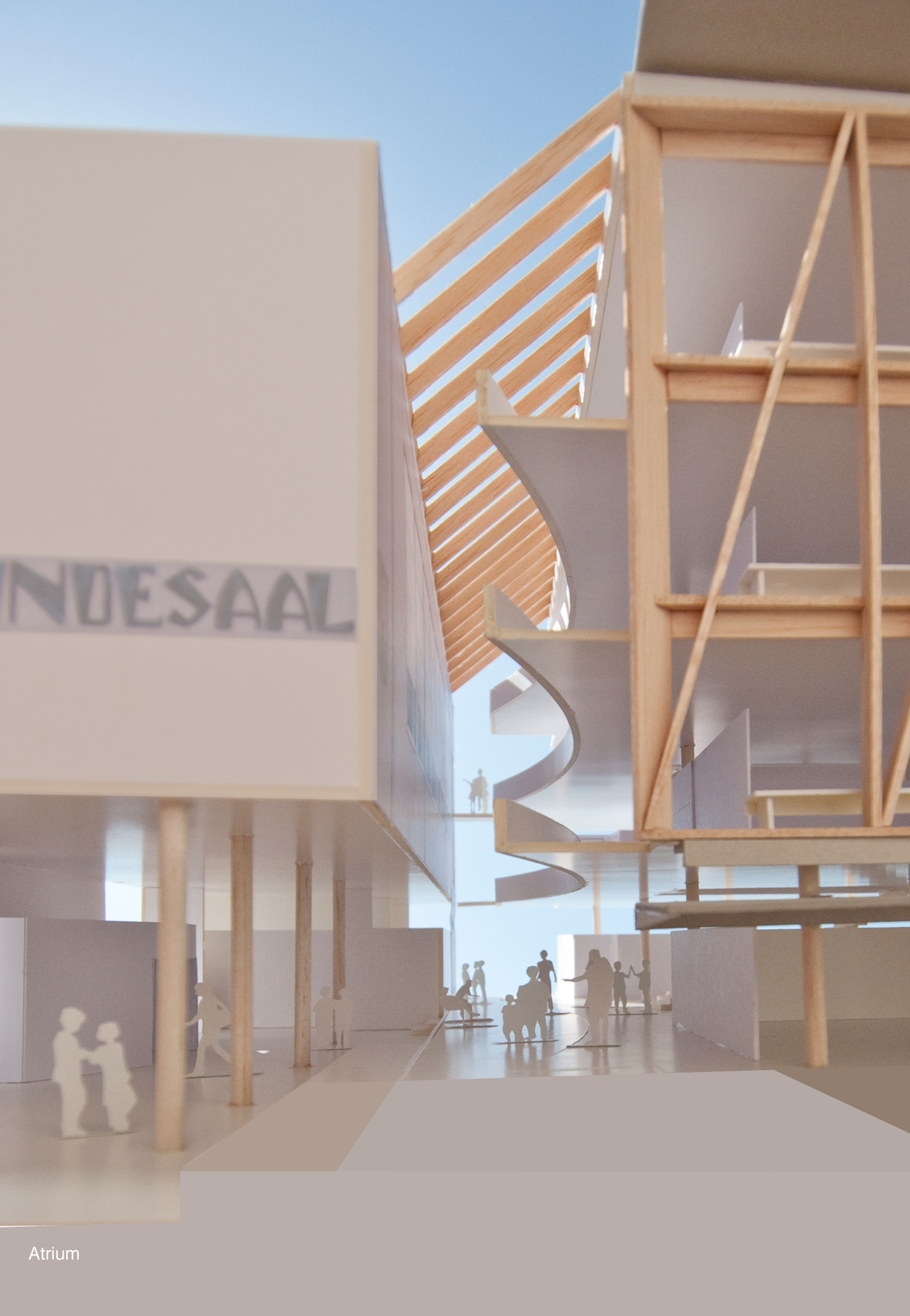 Atrium – Foyer des Gemeindesaals links, Foyer der Erweiterung rechts – Arbeitsmodell  M 1:50