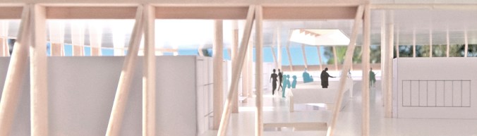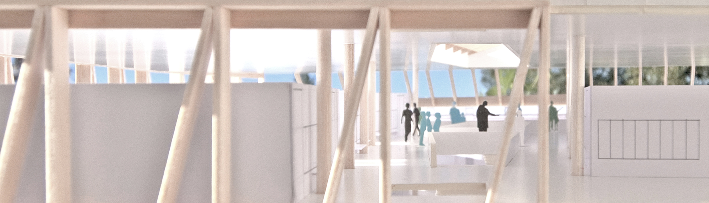 – 3. Obergeschoss und Dachkonstruktion: Stützen, vertikales Fachwerk und horizontaler Balkenrost aus Holz.