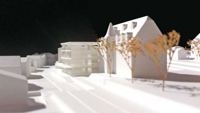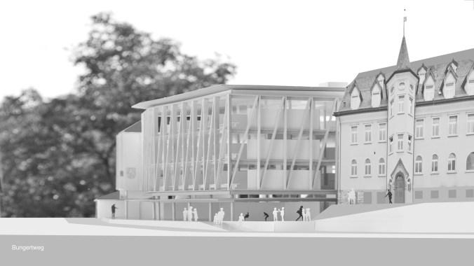 Ansicht von der Hirschengasse – dem Pausenplatz vor dem ‘alten’ Schulhaus und der geplanten Erweiterung