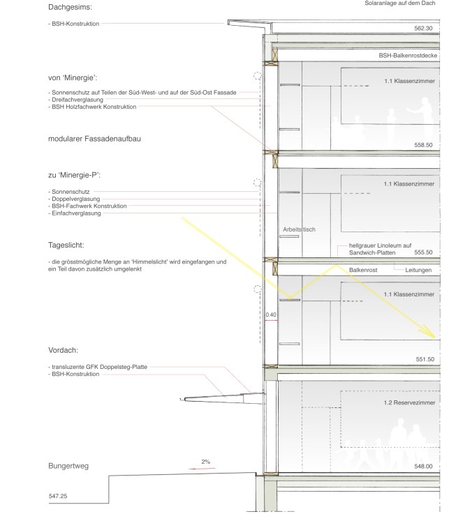 – Erd-, 1. und 2. Obergeschoss, im Bereich der Treppenhalle: Stützen und Decken aus Stahlbeton; Erd-, 1. und 2. Obergeschoss, im Bereich Klassenzimmer: vertikales Fachwerk und horizontaler Balkenrost aus Holz.