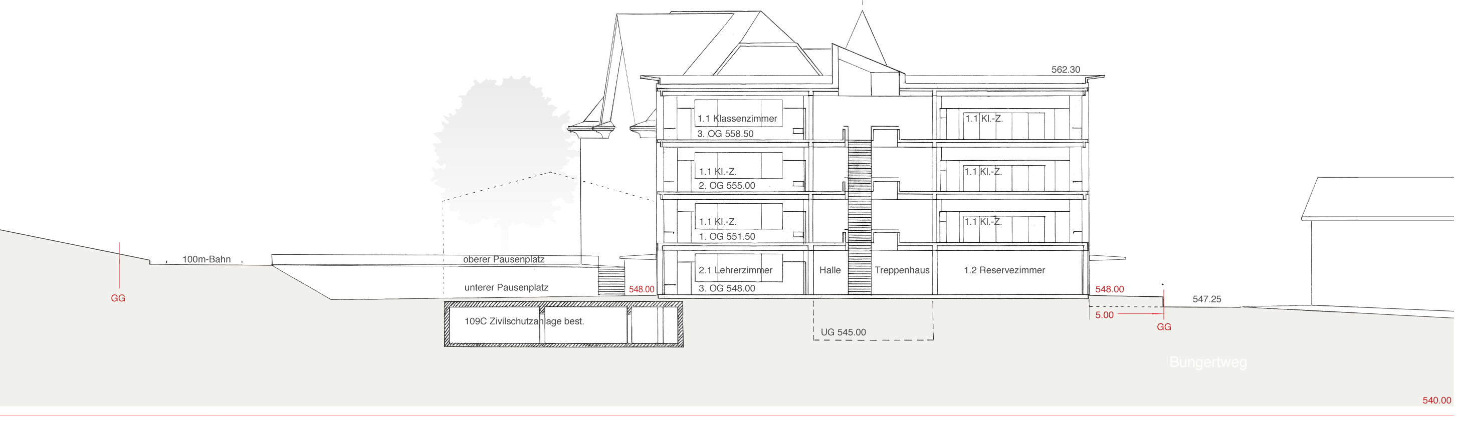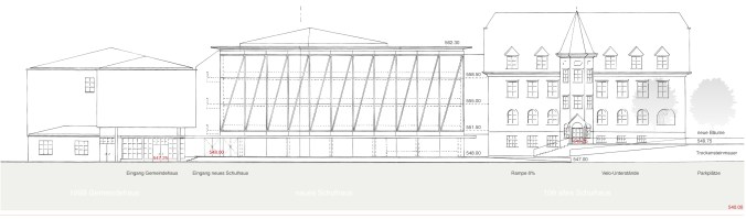 Längsschnitt A-A – das ‘alte’ Schulhaus links, das ‘Gemeindesaal’ Gebäude rechts, dazwischen die neu geplante Erweiterung