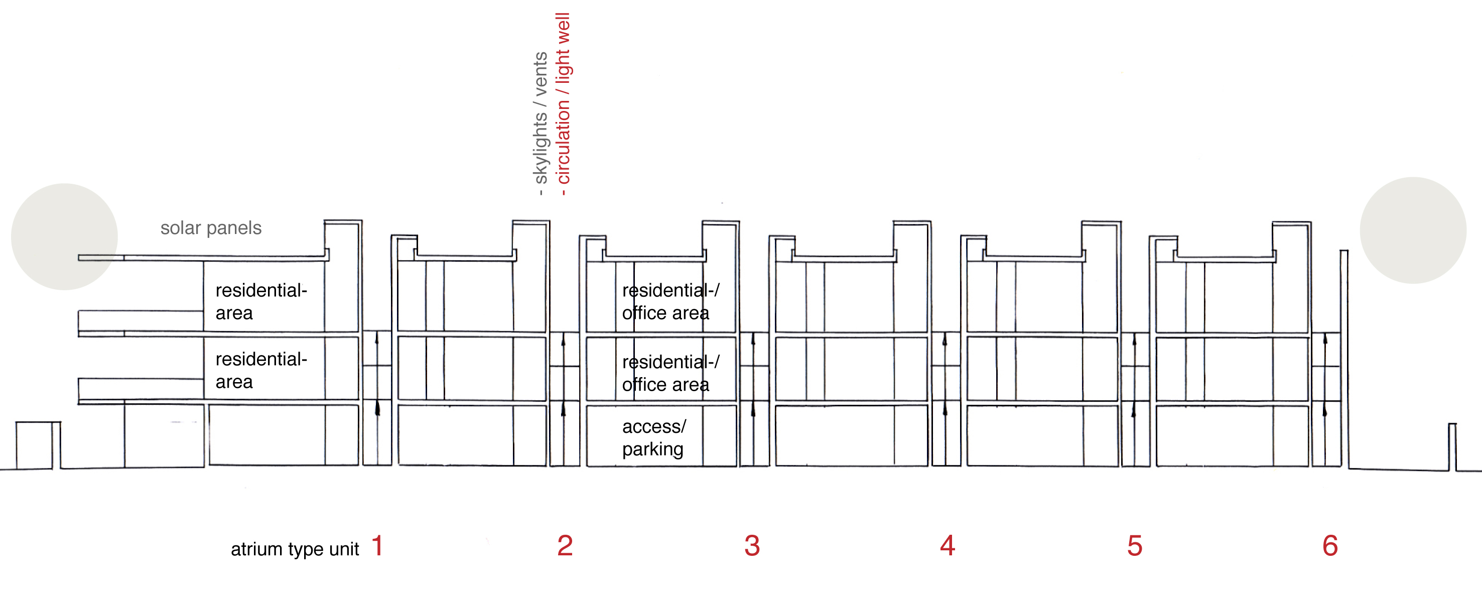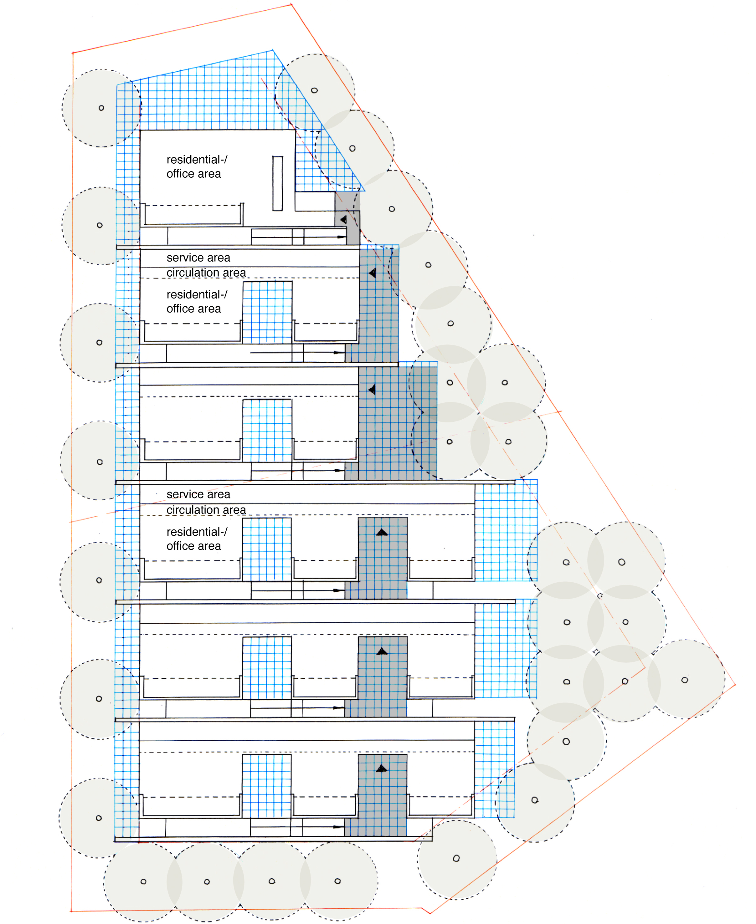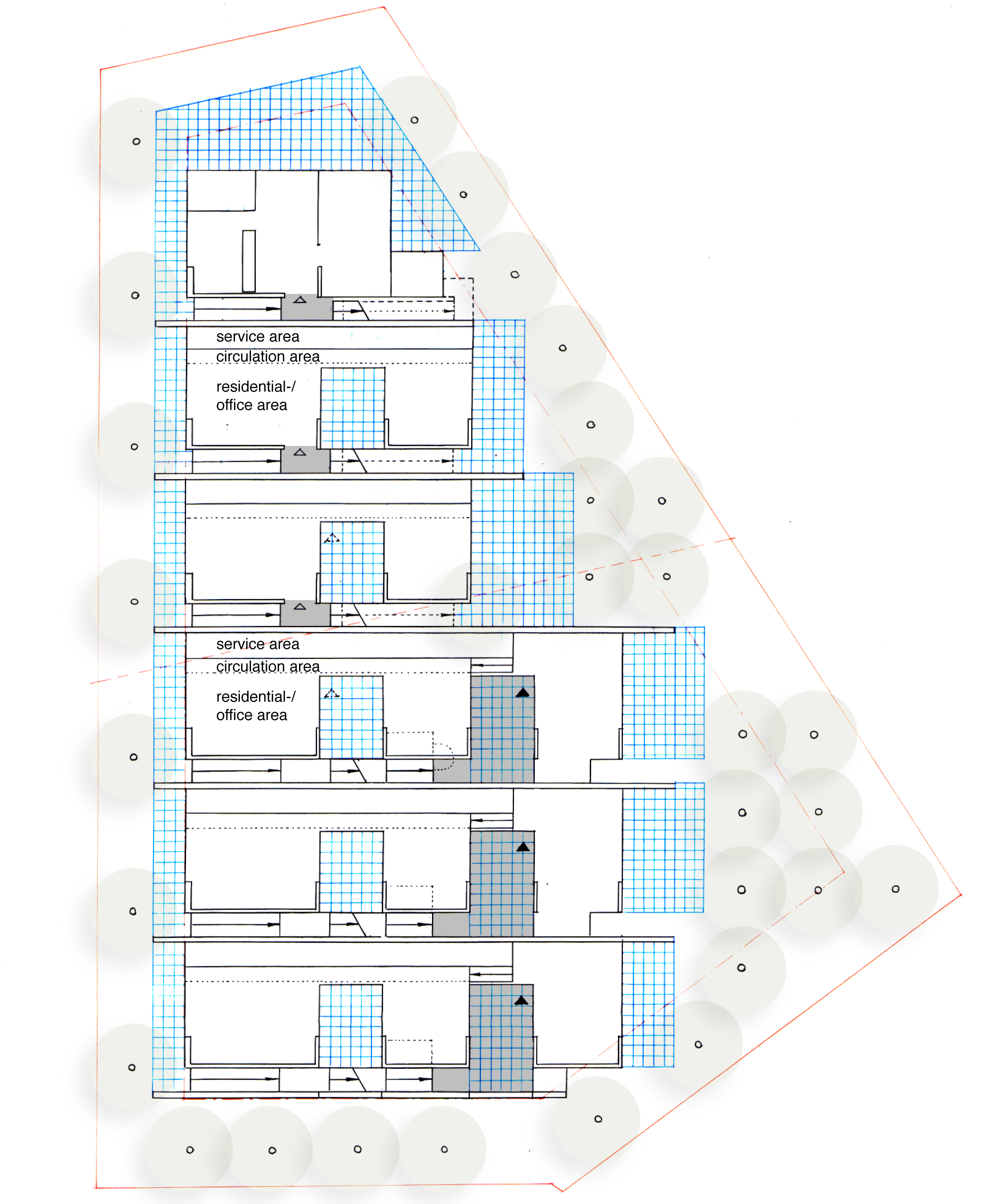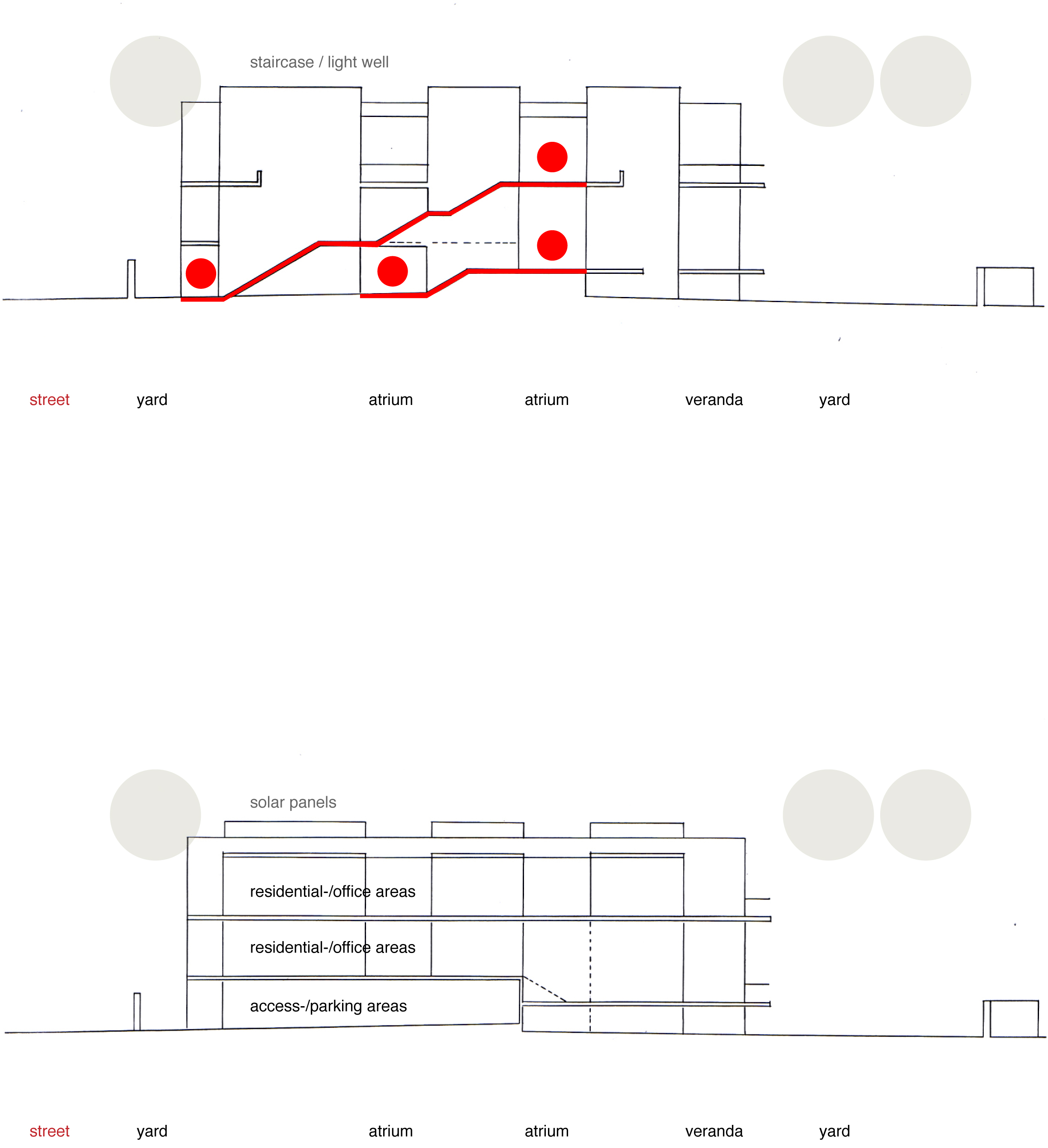 cross sections – circulation, above – residential-/office areas, etc., bottom