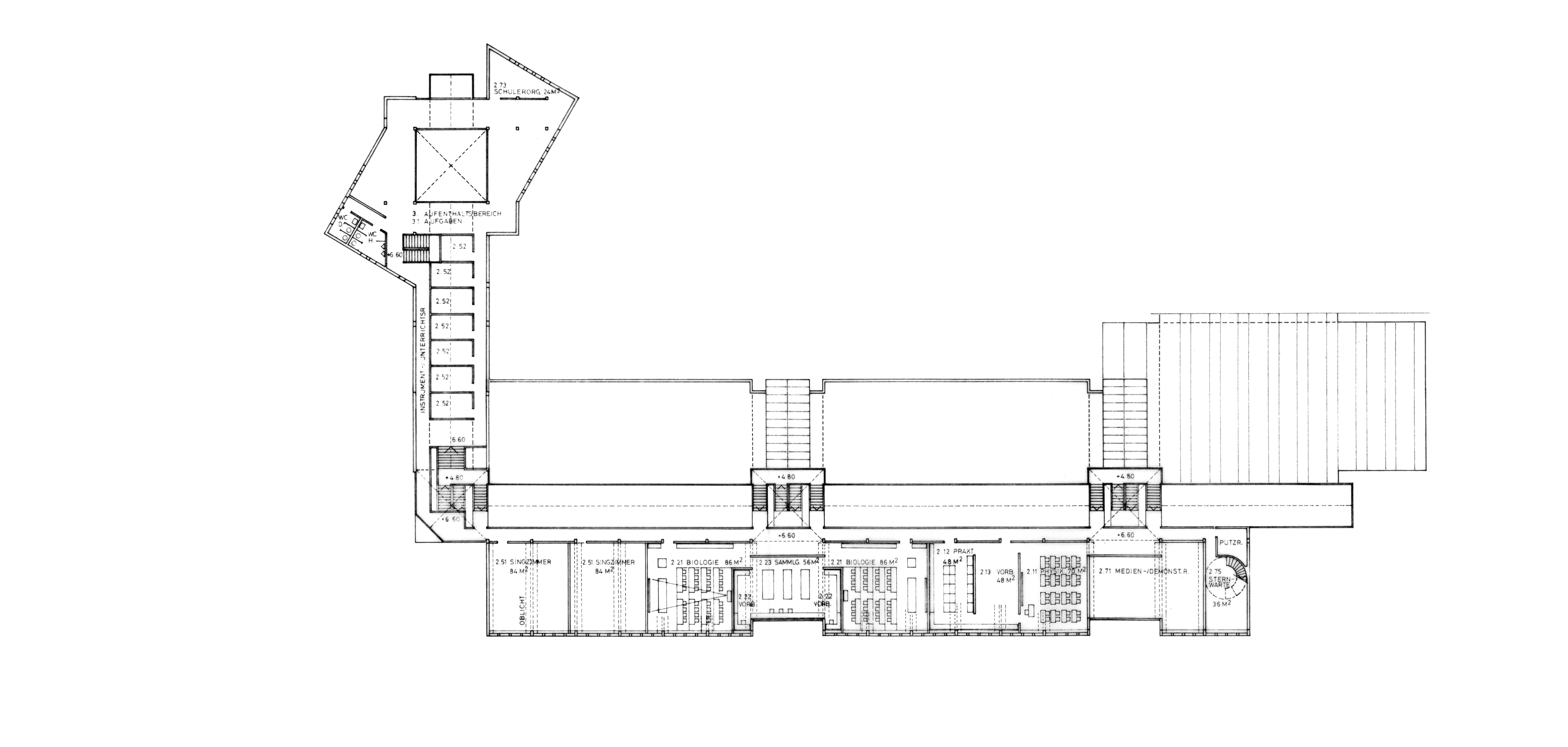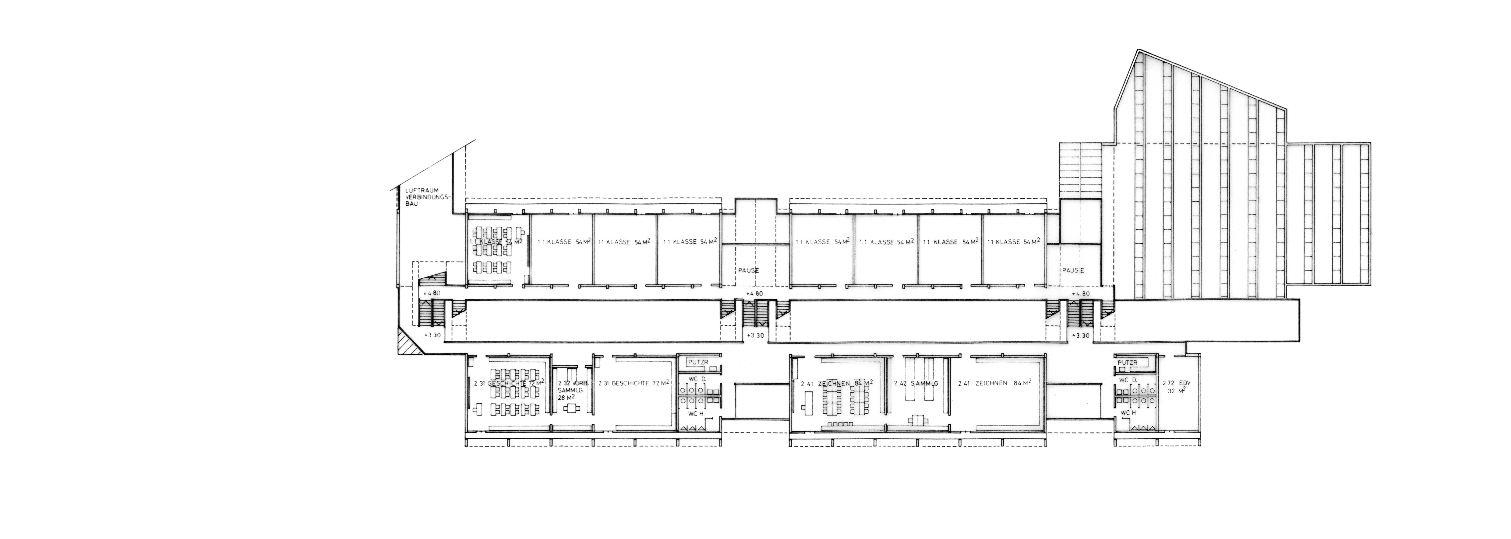 Ansicht Ost – Turnhalle, links – Klassentrakt – Aufenthalts-/Veranstaltungsbereich, rechts
