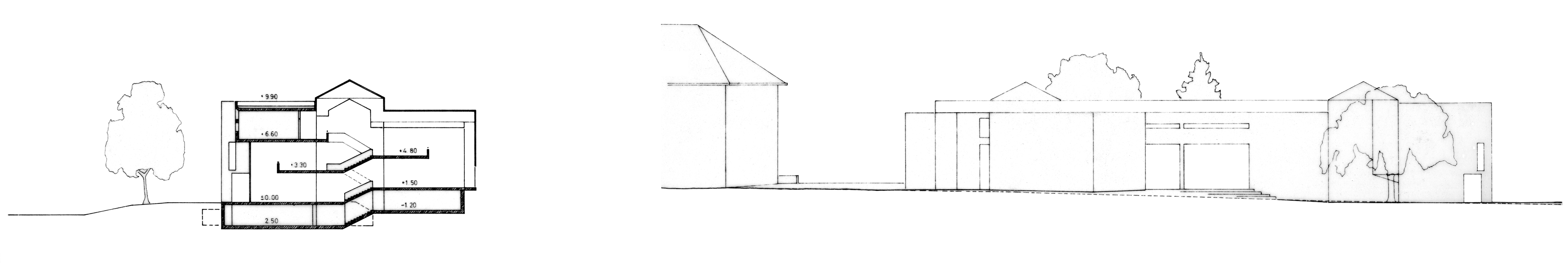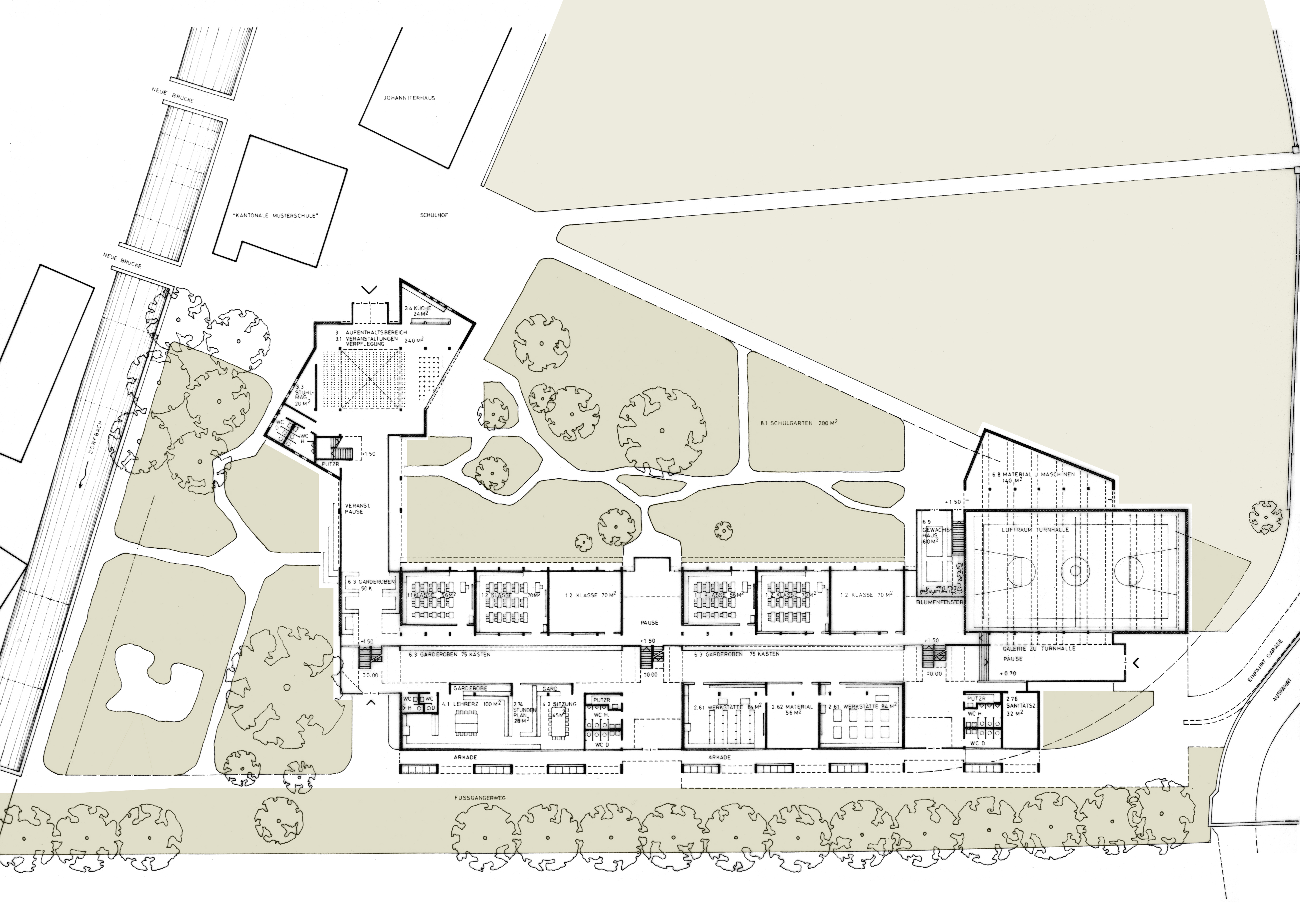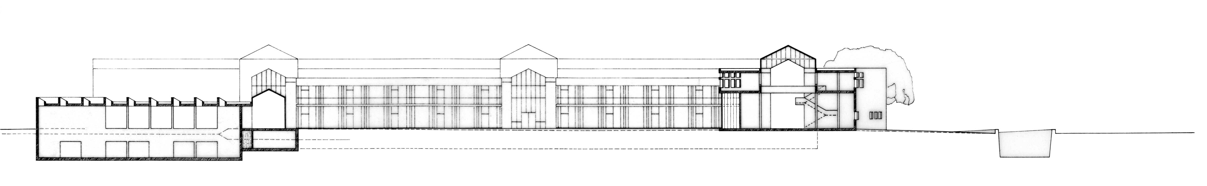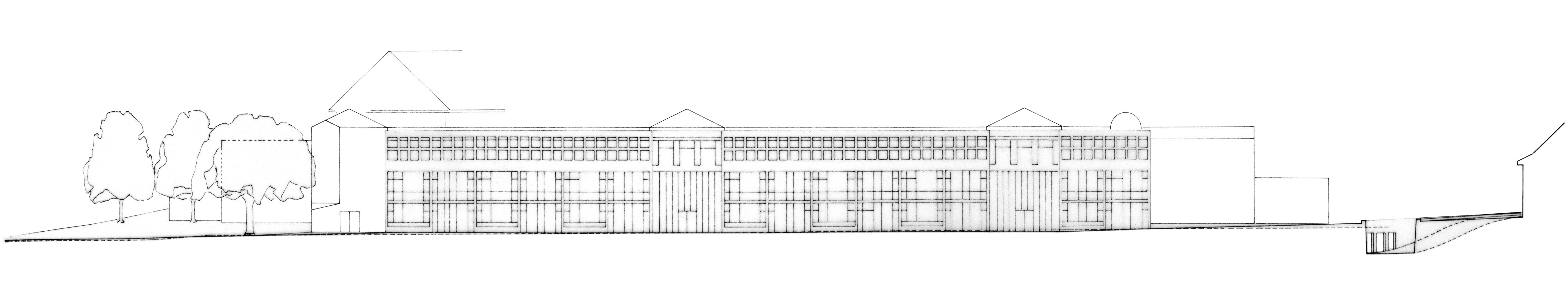 Querschnitt Klassentrakt, links – Ostansicht des vorgeschlagenen Eingangsgebäudes und der vorhandenen Gebäude