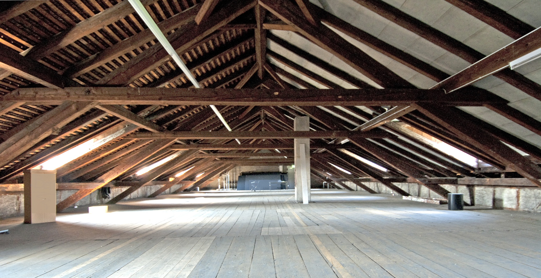 Alternative: Die Decke über dem 3. Obergeschoss wird rausgenommen – ein enorm grosszügiger Raum entsteht, bestens erschlossen, ca, 5.00m hoch bis zur Fusspfette, und ca. 8.00m hoch bis zur Firstpfette des Dachstuhls!