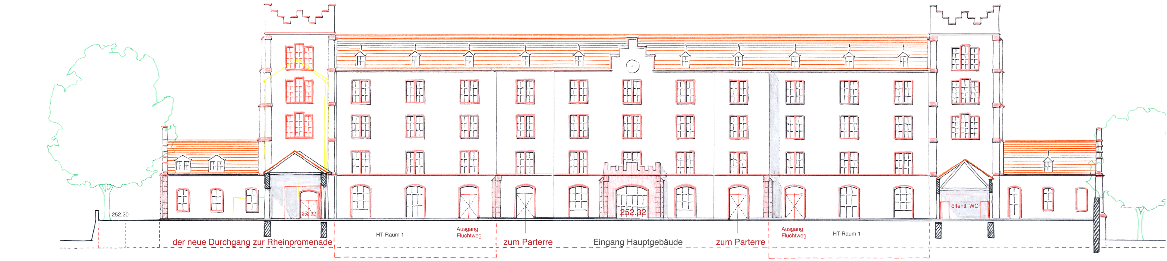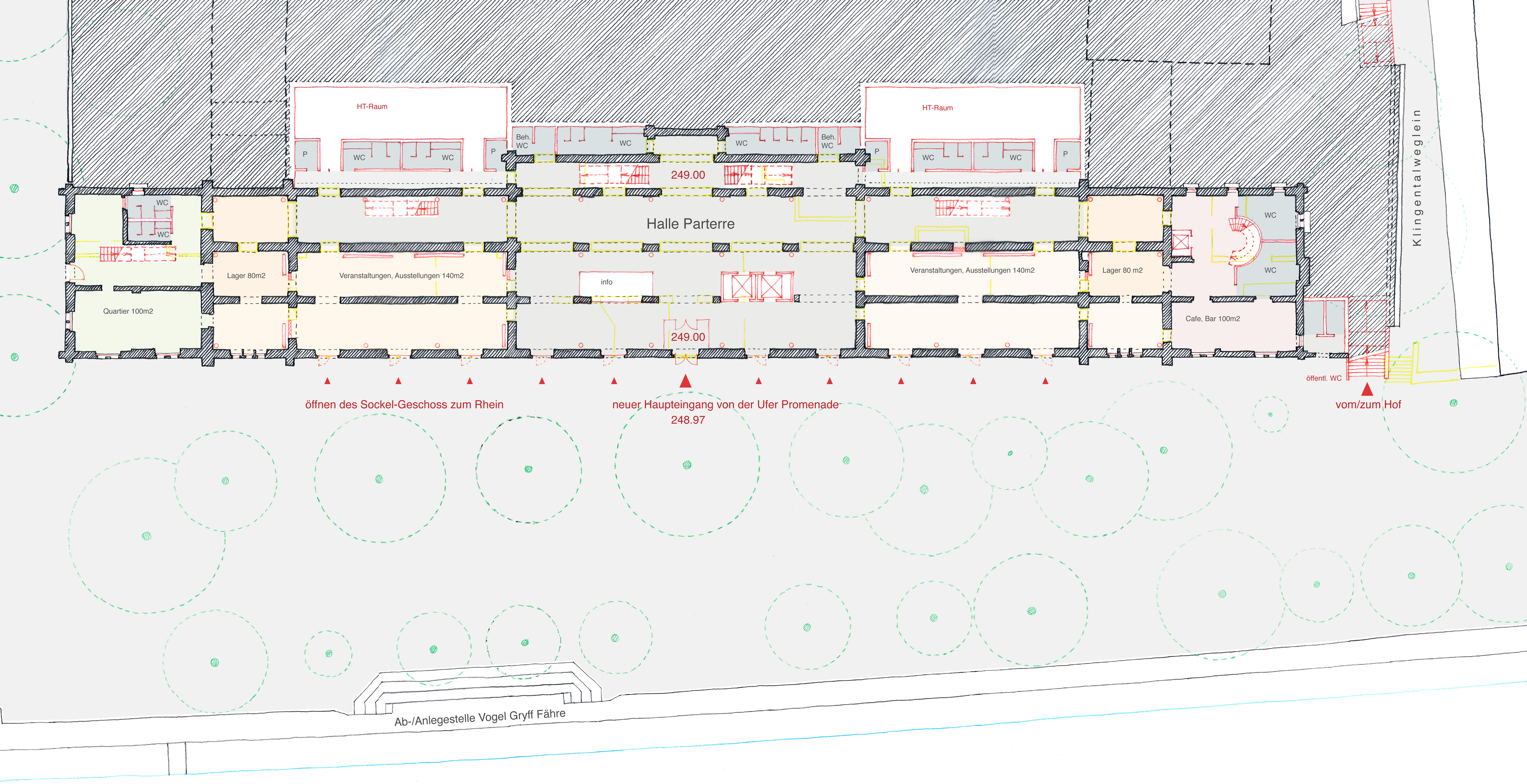 Das vorliegende Projekt steuert den folgenden Beitrag zur zukünftigen Gestaltung der Rheinpromenadebei: Neue (barrierefreie) Verbindungen zwischen Platz und Promenade, Öffnung der neuen Halle und der “geräumigen Parterreräume” zur Rheinpromenade; Integration der öffentlichen Sanitärräume in den Hauptbau (und damit Entlastung der Promenade von störender “Möblierung”); alle Bäume werden erhalten.