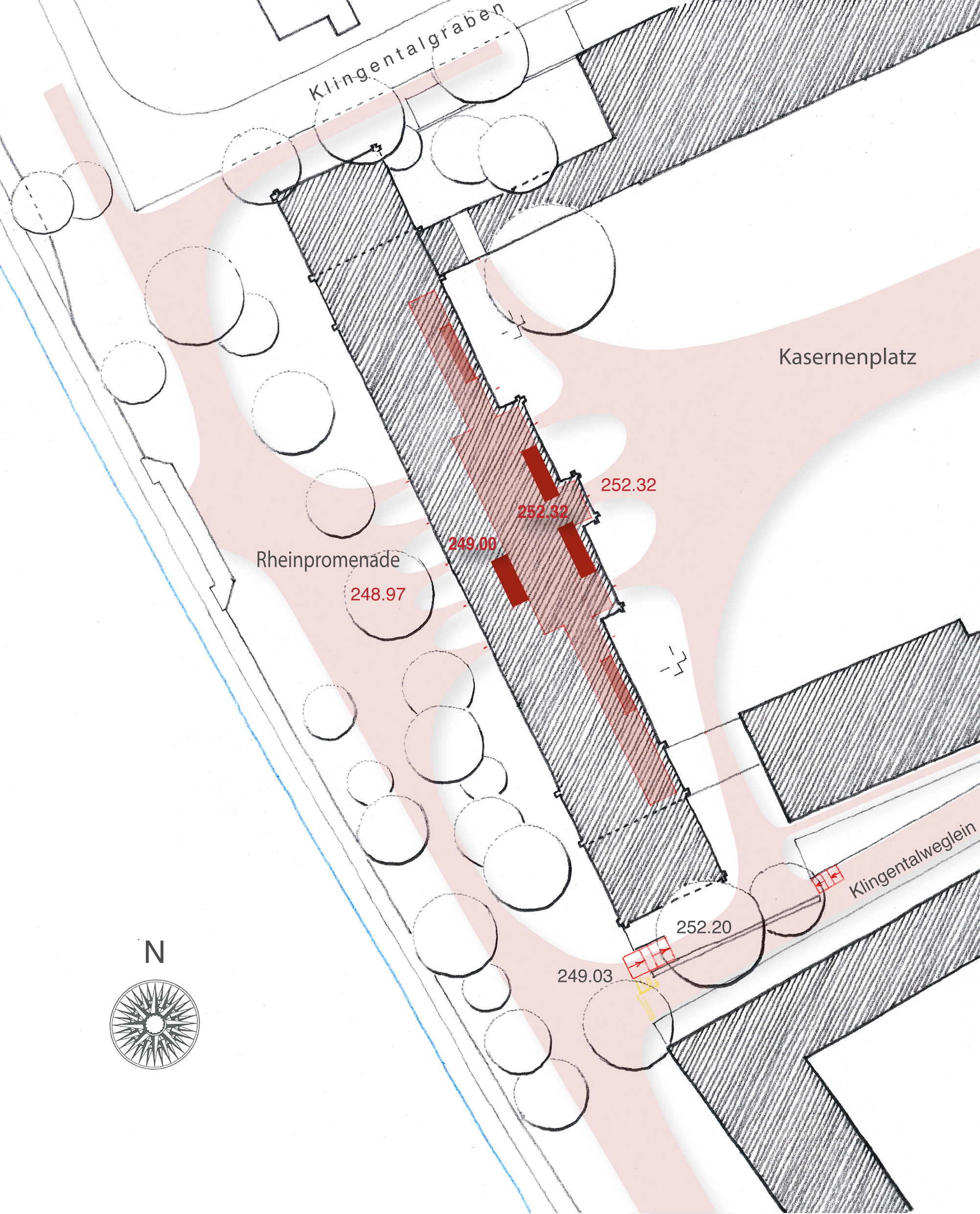 Erschliessung – Der Kasernenplatz ist über die neue “Öffnung” zwischen dem Hauptbau und der Kirche sowohl mit dem Klingentalweglein als auch mit der Rheinpromenade verbunden.