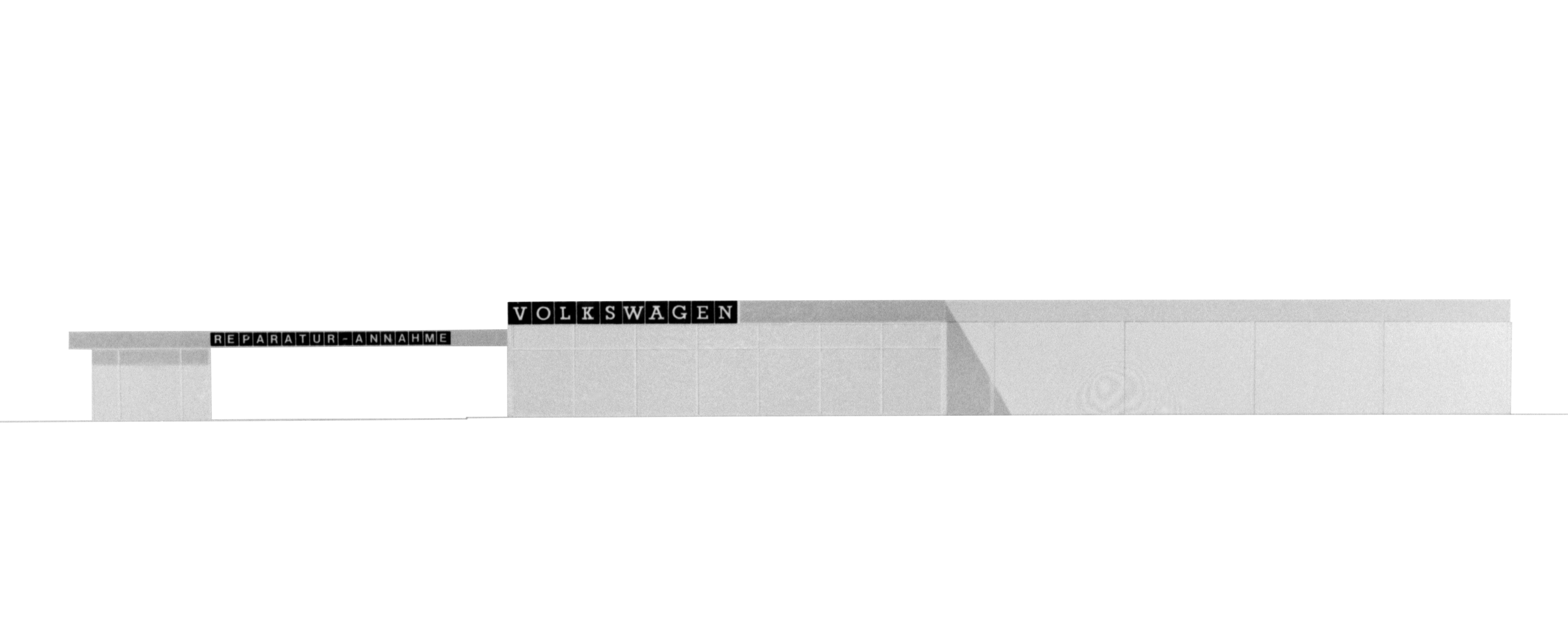 Ansicht.– Aussenbeschriftung als Baukastensystem; gute Eingliederung in die jeweilige Architektur der VW-Werkstätten