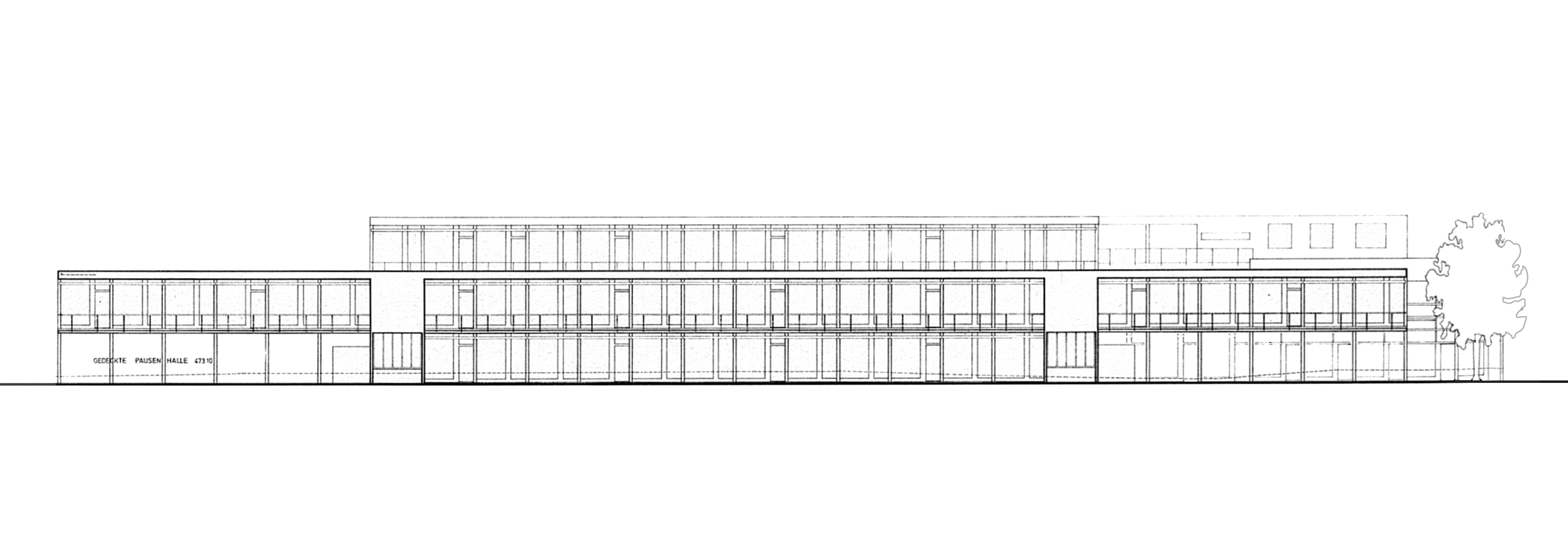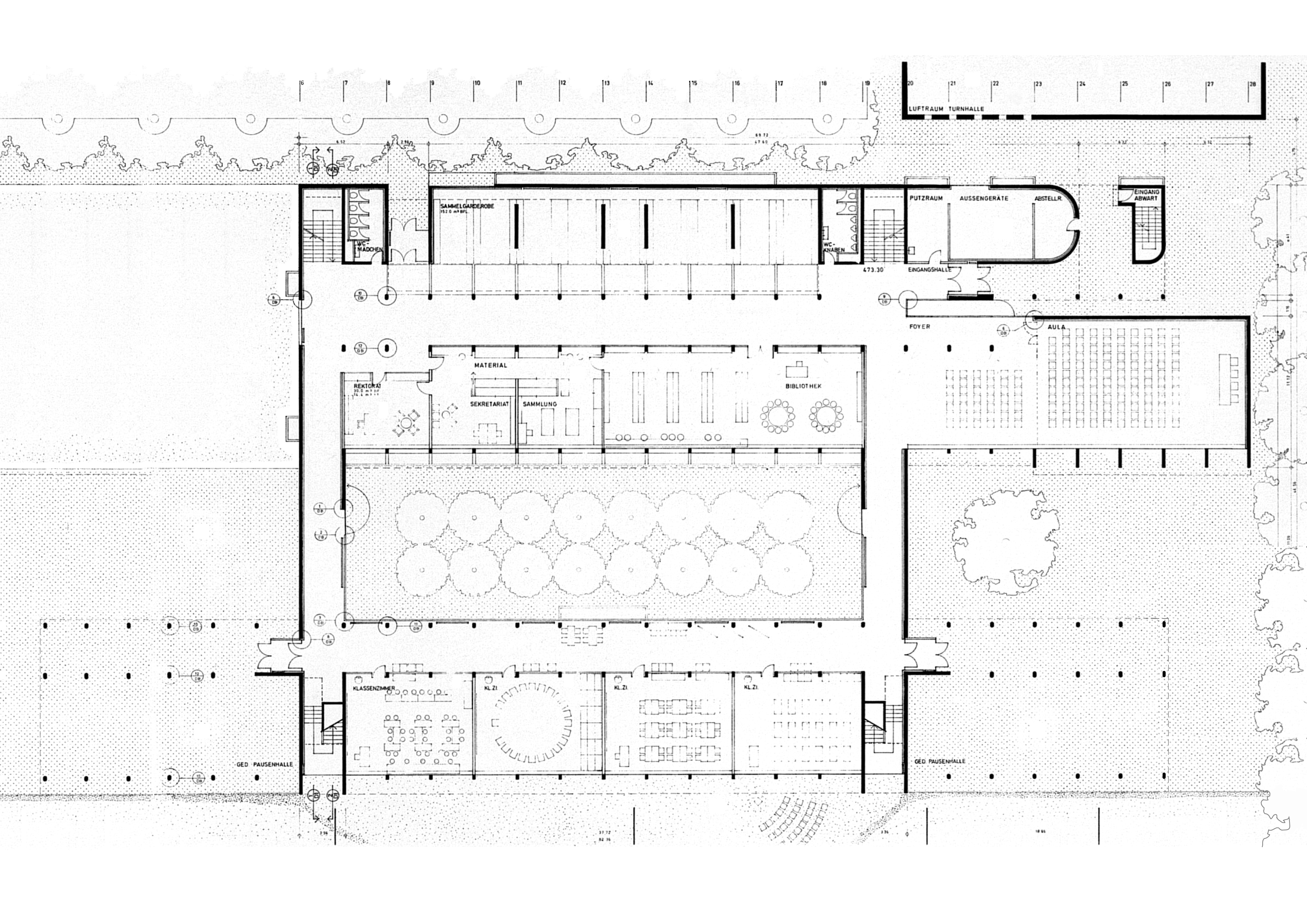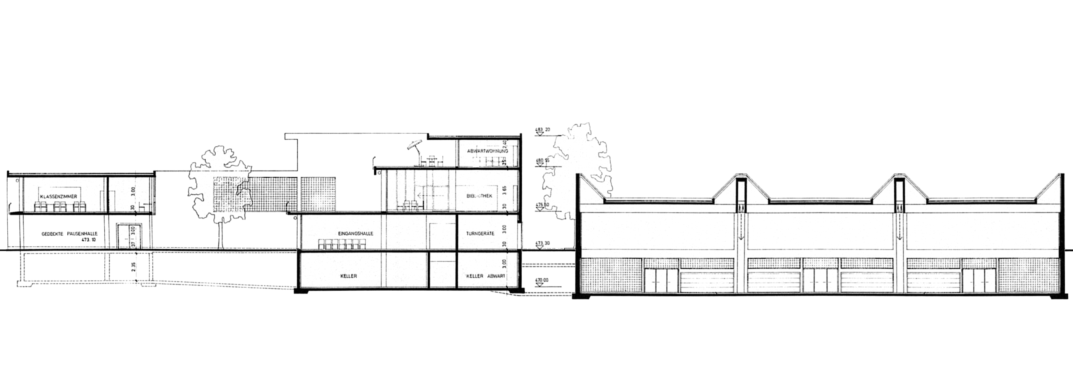 Querschnitt – Schultrakt, Hof/Portico, Auditorium, Turnhalle