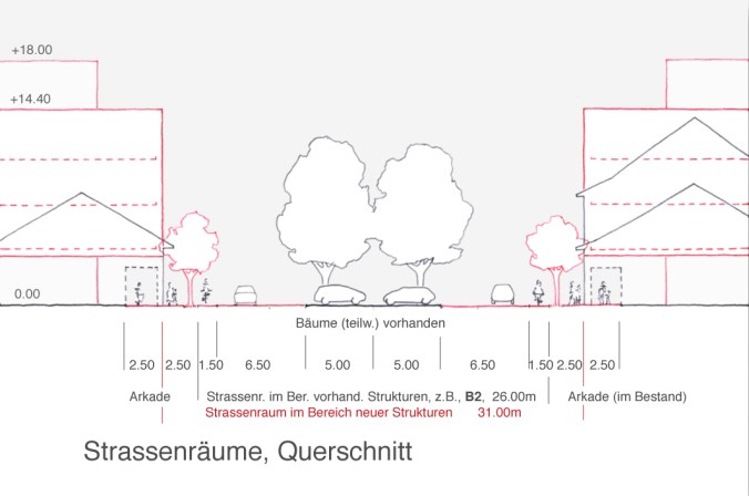 2) Die vorhandenen und die neuen Quartierstrassen sollen zu Alleen umfunktioniert werden. Mittig, im Bereich der heutigen Kopfsteinpflästerung und der Bäume, die Parkierung für die Bewohner/Besucher, beidseitig davon die PKW- und Fahrradspuren, Anlieferungsbuchten, Gehwege und, im Bereich vorhandener Gebäude, die neuen Arkaden.