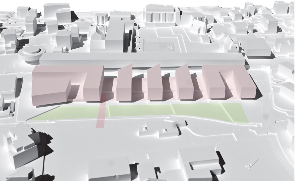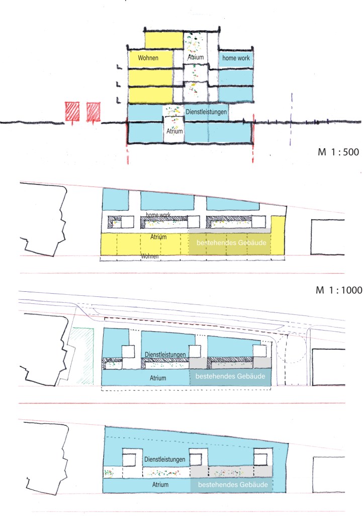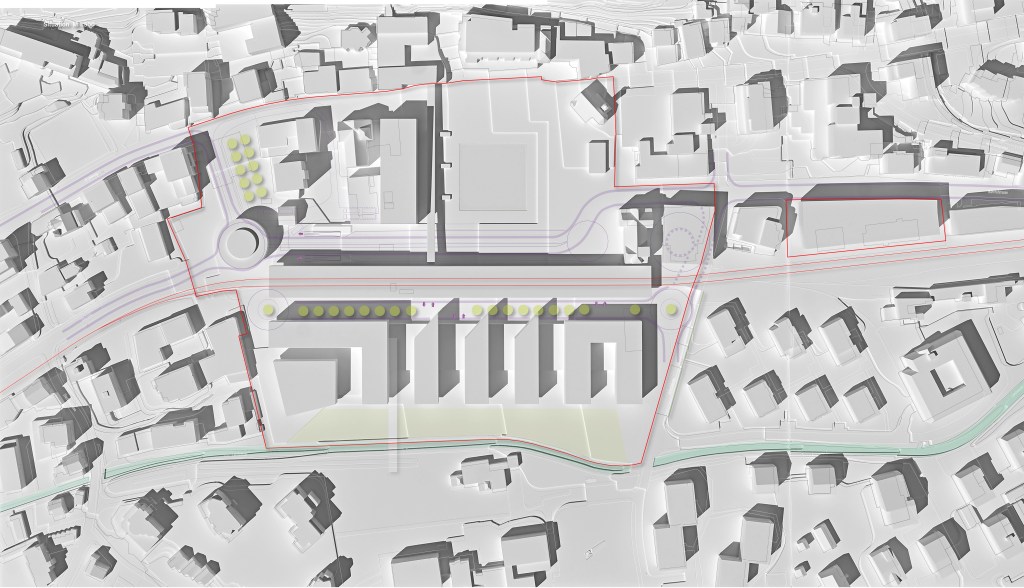 Die vorgeschlagenen Gebäude liegen auf einem Sockelgeschoss, paralell zur neuen, talseitigen Erschliessungsstrasse. Entlang dieser sind Dienstleistung, Gewerbe und “Schlechtwetternutzung” untergebracht.