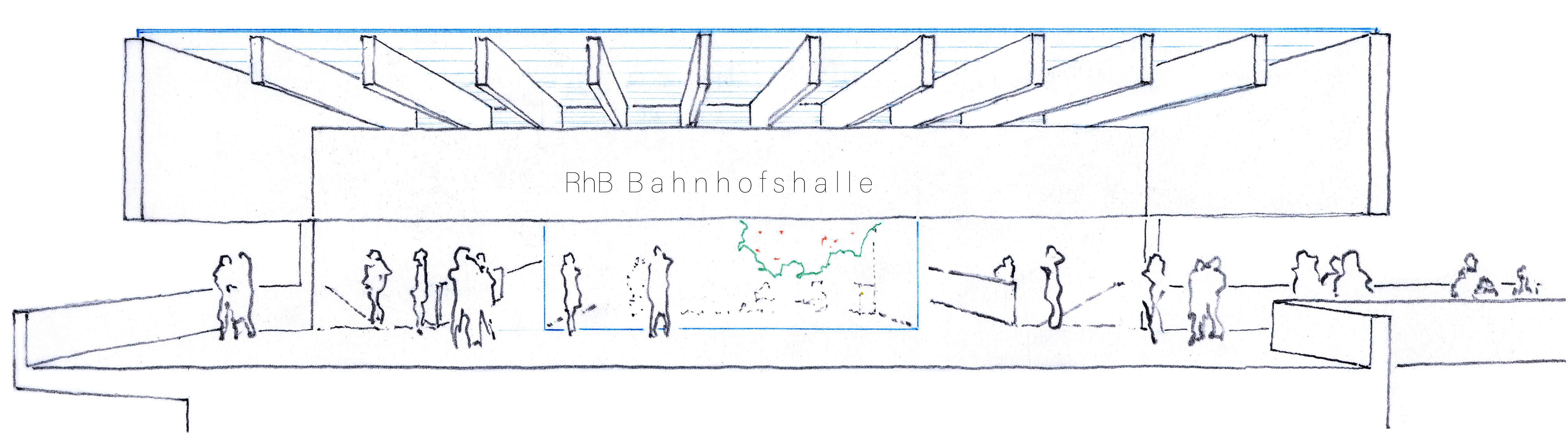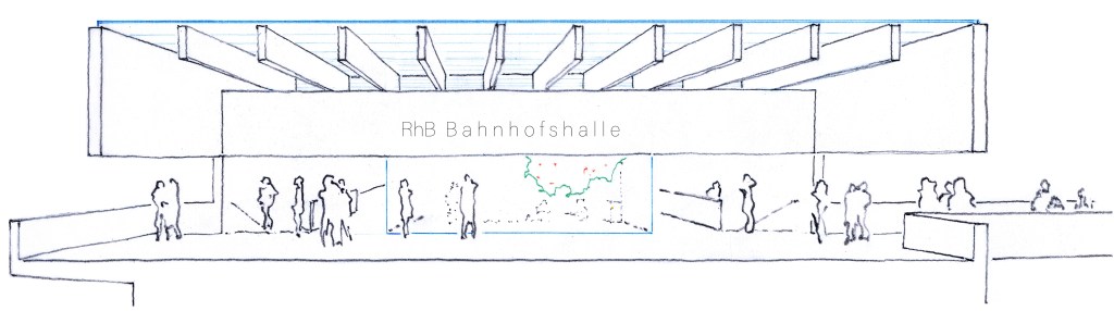 Die Überqueung von der Perron-/Platz-Ebene führt, via Rampen, Treppen und Lifts zur Bahnhofshalle der RhB. Von da, via Passerelle über die Bahnhofstrasse und den Platz, dirkt zur Parsennbahn (welche inzwischen eine tolle Eingangshalle erstellt hat :-).