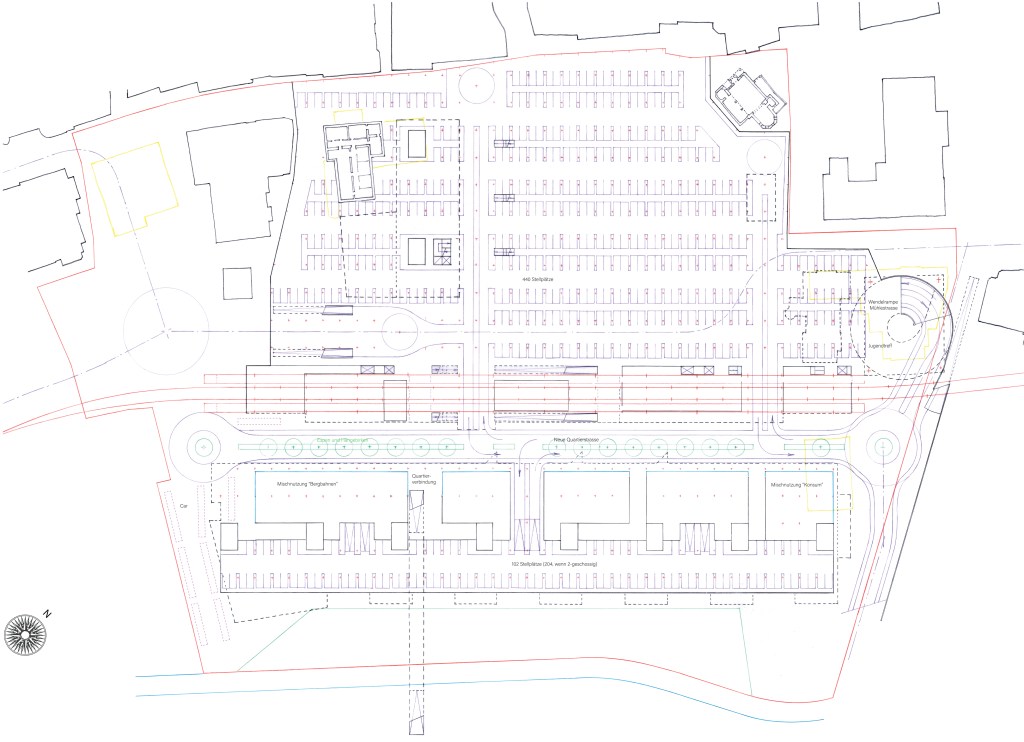Vermerk: Der Begriff “Einstellhalle” wird hier durch den Begriff “Mobilitätshub” ersetzt; dem Projet “Lux” liegt eine digital ausgerichtete “Mobilitätsphilosophie” zugrunde, unter welcher sich Fahrzeuge ‘rund um die Uhr’ bewegen (heute steht die Mehrheit der sog. ‘Auto-Mobile’ durchschnittlich >90% des Tages irgendwo herum). “Sharing-/selfdriving-Systeme” werden, im Zeitraum der nächsten 10-15 Jahre, den herkömmlichen Stellplatzbedarf um >60% senken. Ein willkommener und dringend notwendiger Beitrag zur Nachhaltigkeit.