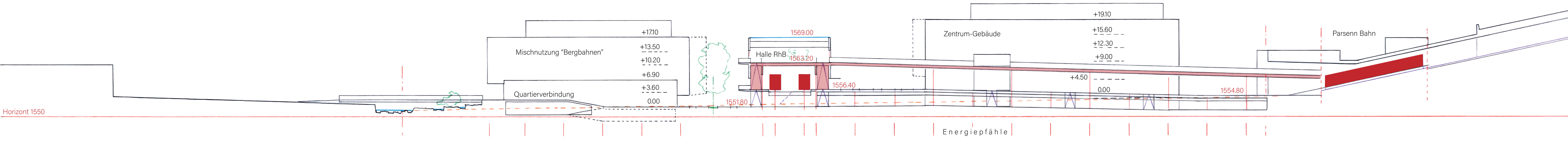 Darunter liegen, den Höhenversprung ausnutzend, 1) Quartierverbindungen, 2) Ein-Aus-/Fahrten des Mobilitätshub’s (Einstellhalle), 3) Velo, e-Bike, e-Moto und e-Auto-Stellplätze, 4) Betriebsräume und die “publikumsorientierten” Nutzungen der RhB und, 5) die Service-Räume des Hotel Montana.