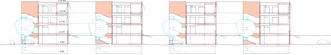 Mit dem ALHO-Systemmodul 3.875 x 10.250 x 3.65, 184 Stück, werden sowohl die einzelnen Wohnungen als auch die Gebäude gefügt. Zusätzlich kommt das Modul 3.875 x 15.250 x 3.650, 8 Stück, für die rückwärtige Verbindung der Gebäude zur Anwendung; das Modul 2,625 x 15.250 x 3.200, 3 Stück, dient der Überdachung der internen Verbindungswege.