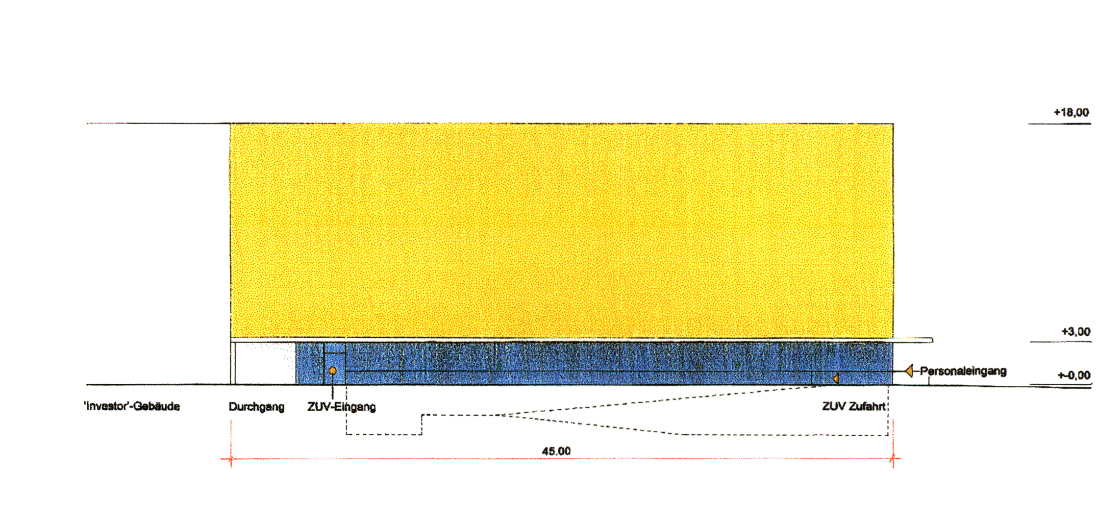 Nord-Ost Ansicht – von der Erich Thilo Strasse – links, das vorgesehene “Investor-Gebäude”